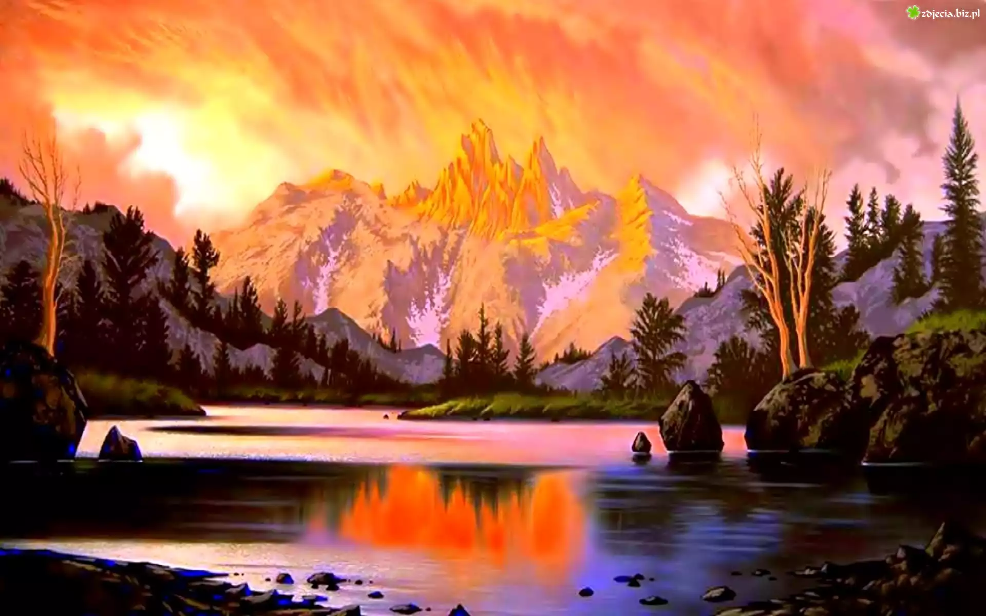 Zdjęcie Malarstwo, Jezioro, Góry, Drzewa