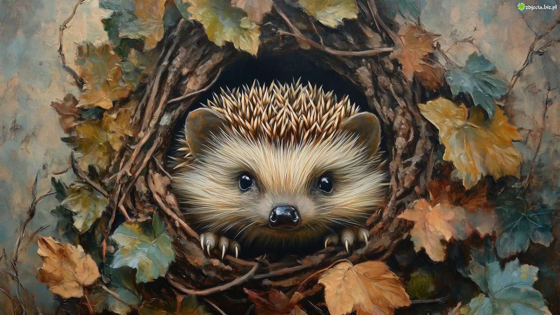 Zdjęcie Jeż, Liście, Gniazdo, Malarstwo