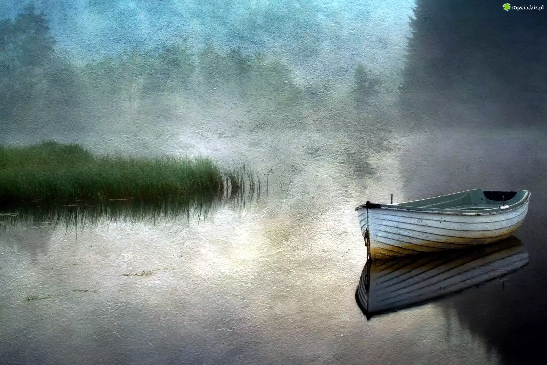 Zdjęcie Malarstwo, Obraz, Łódka, Jezioro, Szuwary