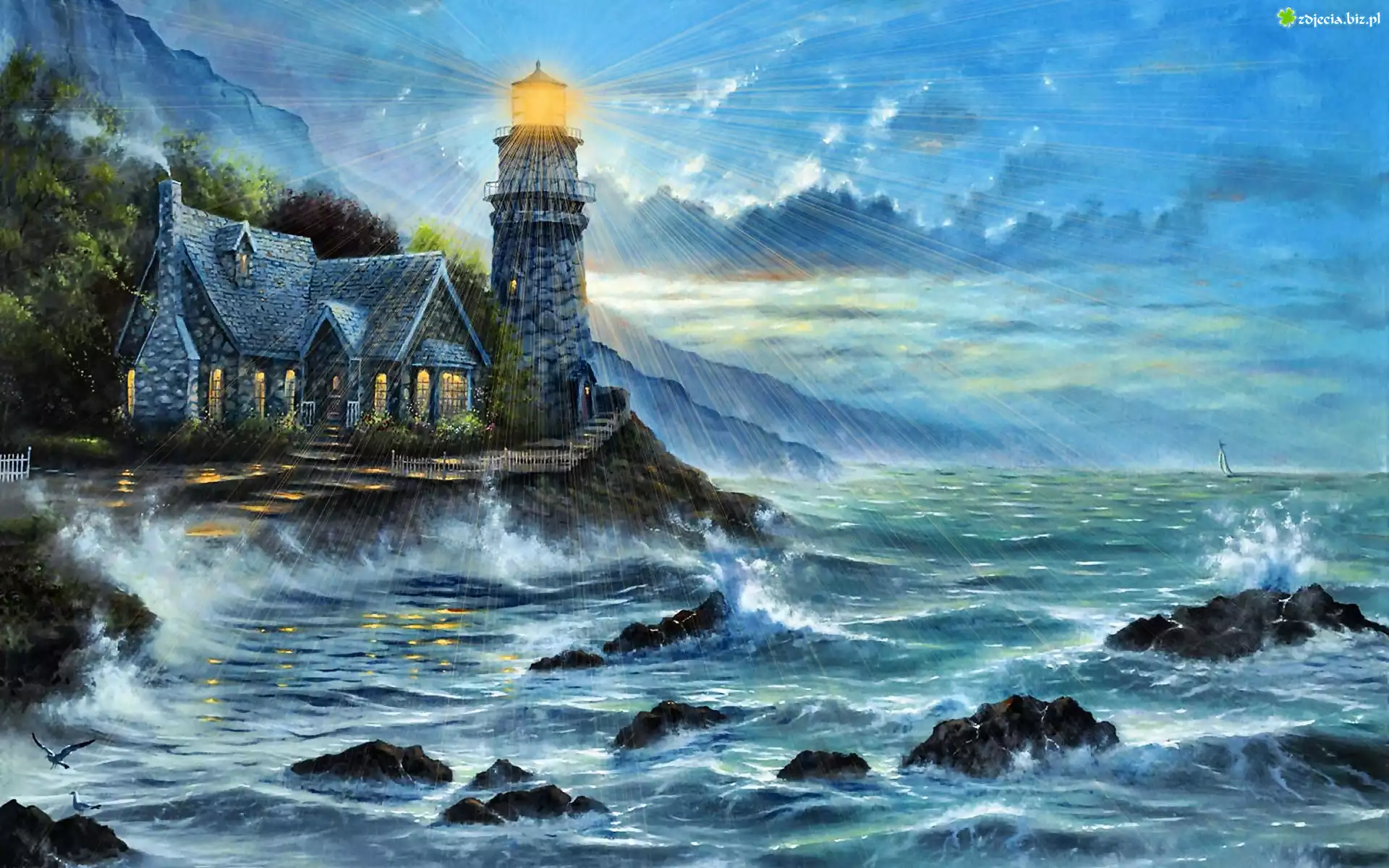 Zdjęcie Malarstwo, Obraz, Morze, Latarnia, Morska, Dom