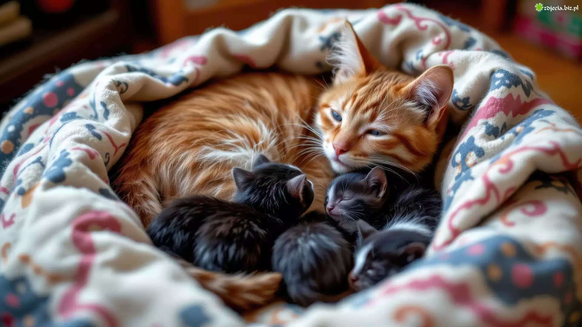 Zdjęcie, Rudy, Kot, Czarne, Małe, Kotki, Posłanie