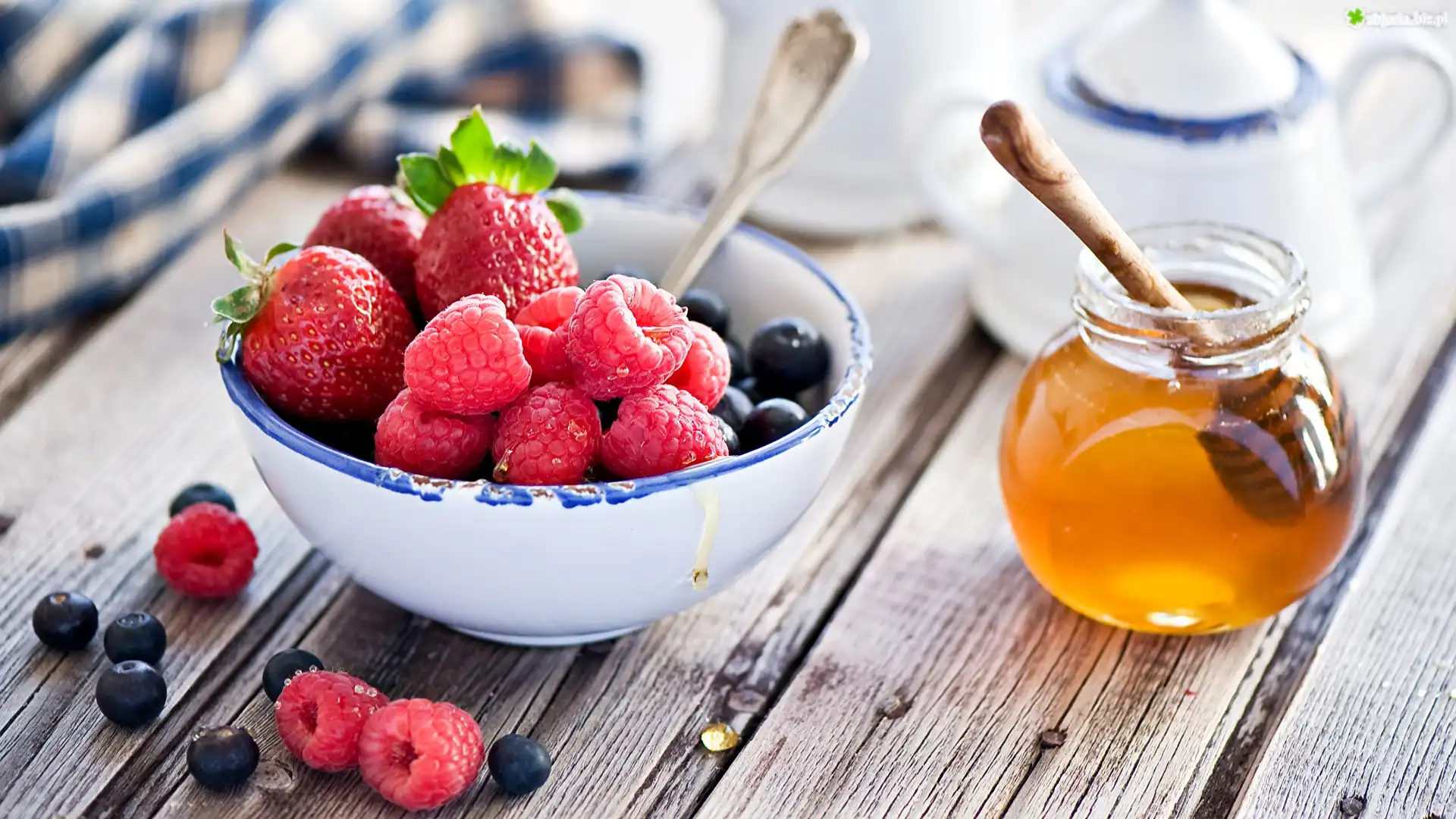 Zdjęcie Maliny, Truskawki, Jagody, Miód, Miseczka, Słoik