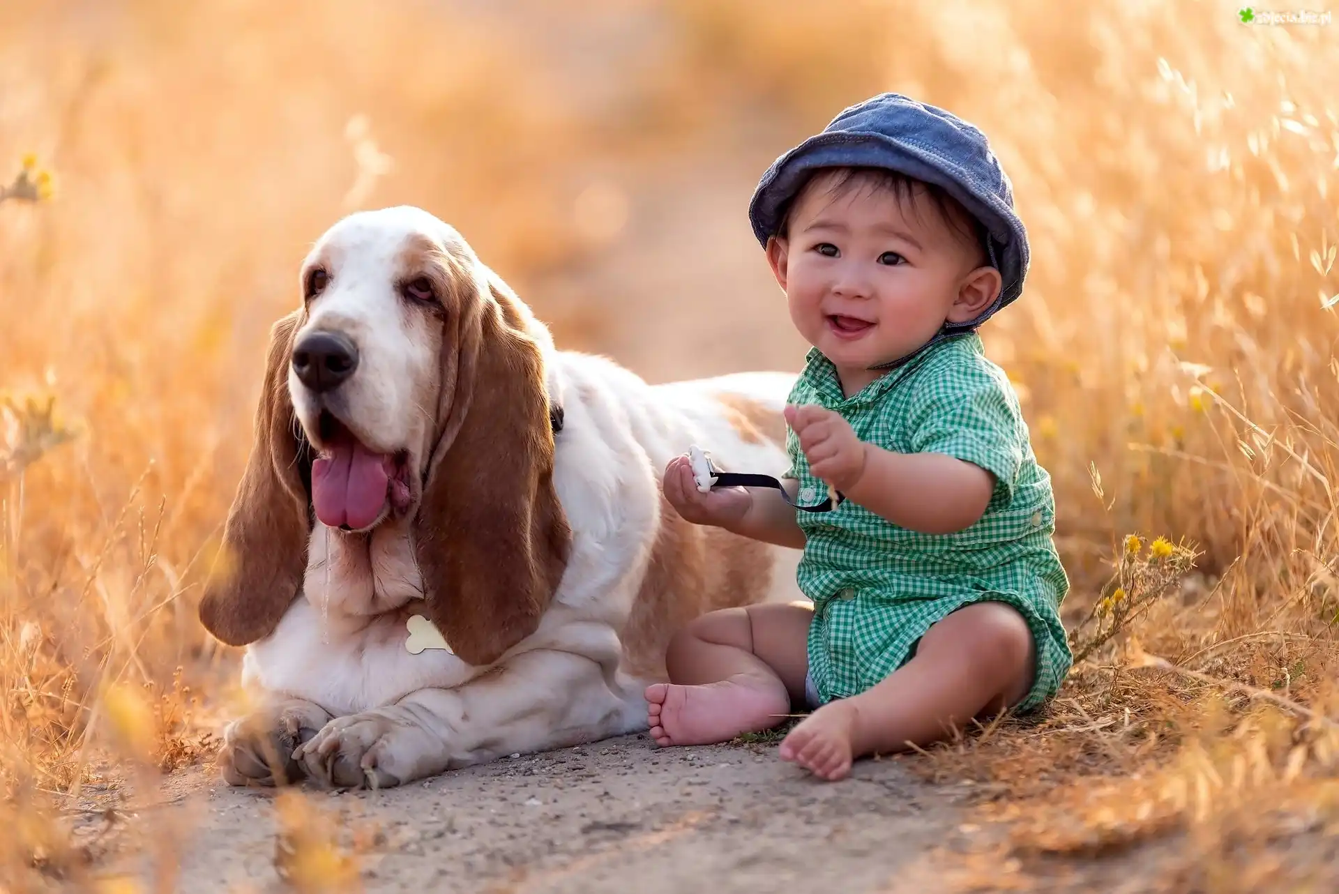 Zdjęcie Mały, Chłopczyk, Pies, Basset, Łąka, Trawa