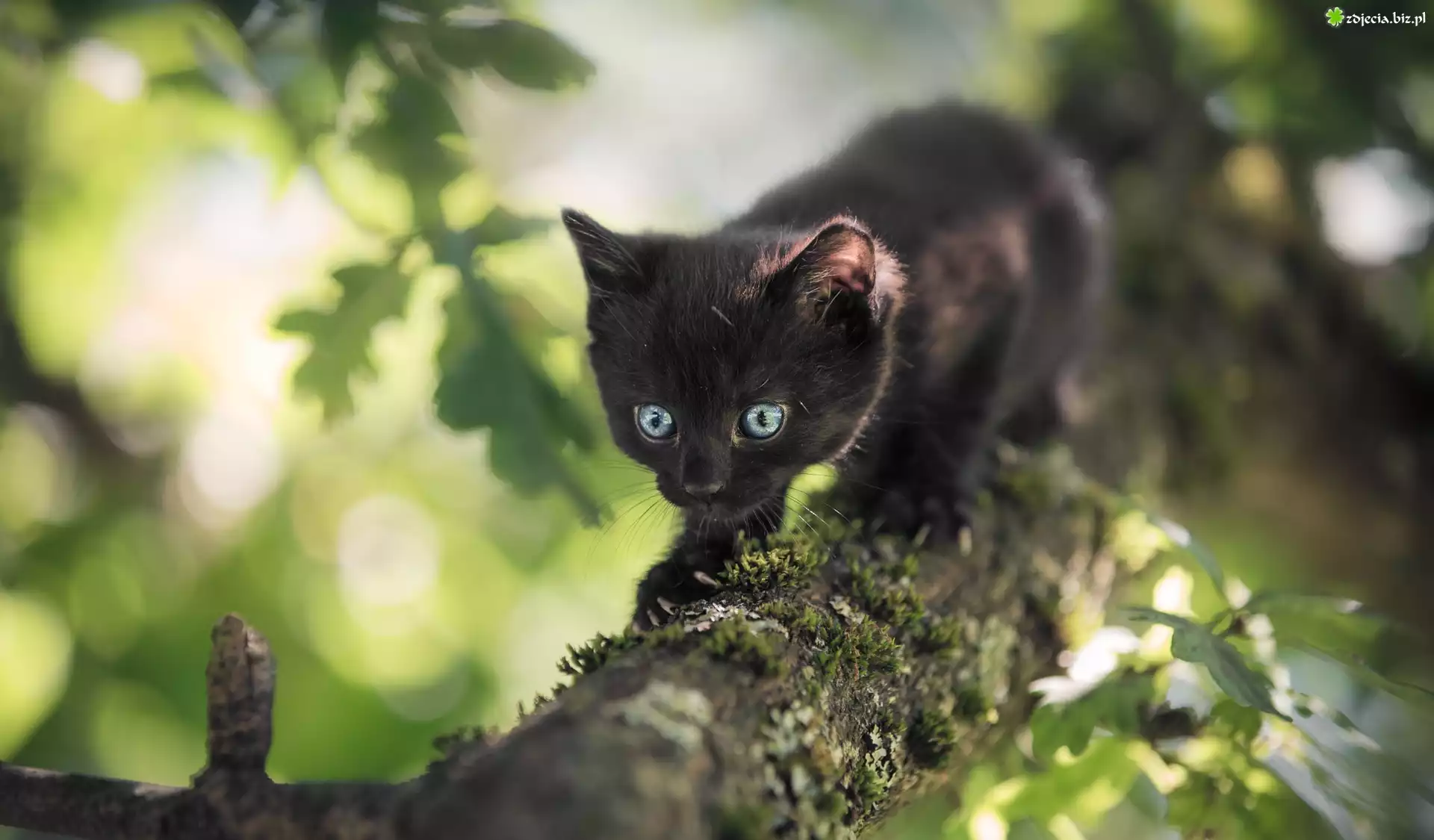 Zdjęcie Mały, Kotek, Czarny, Drzewo, Konar