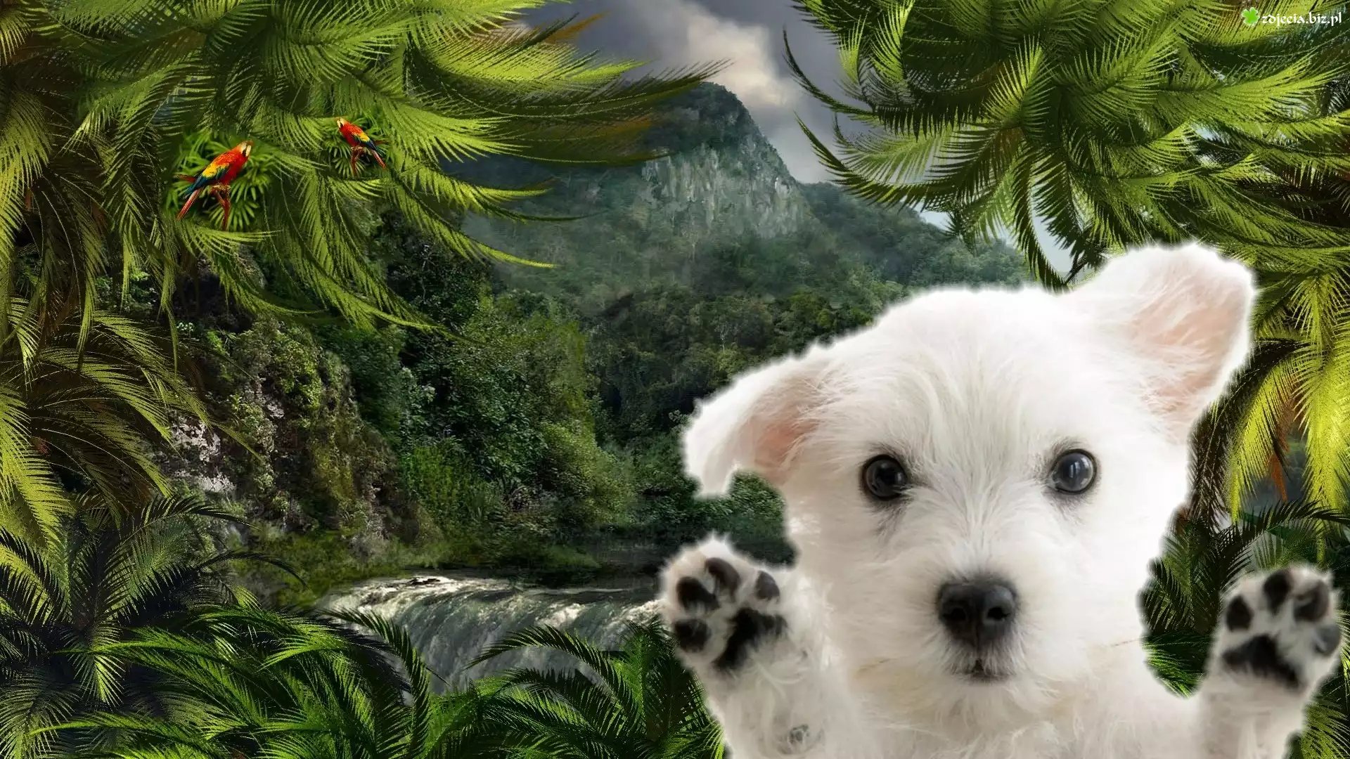 Zdjęcie, Mały, Biały, Piesek, Wodospad, Palmy