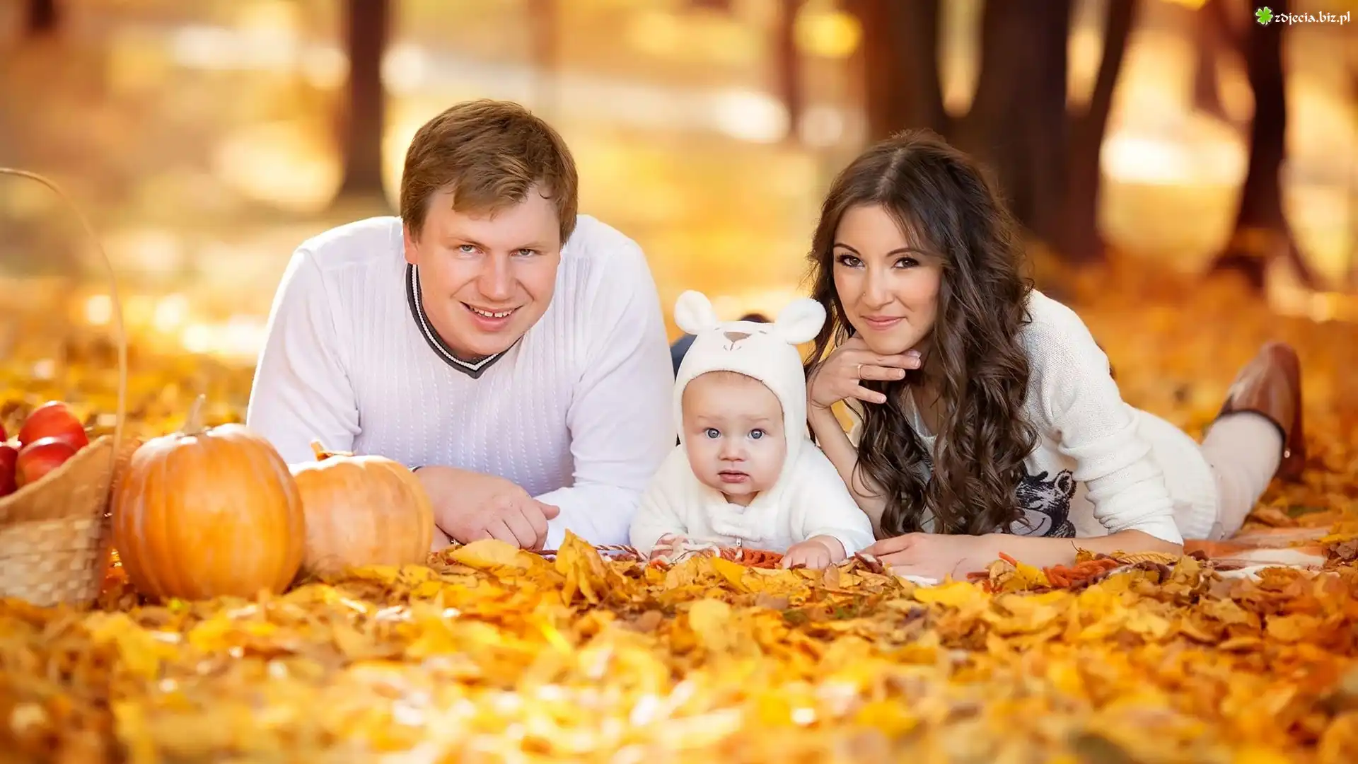 Zdjęcie Mama, Tata, Dziecko, Jesień, Liście, Dynie