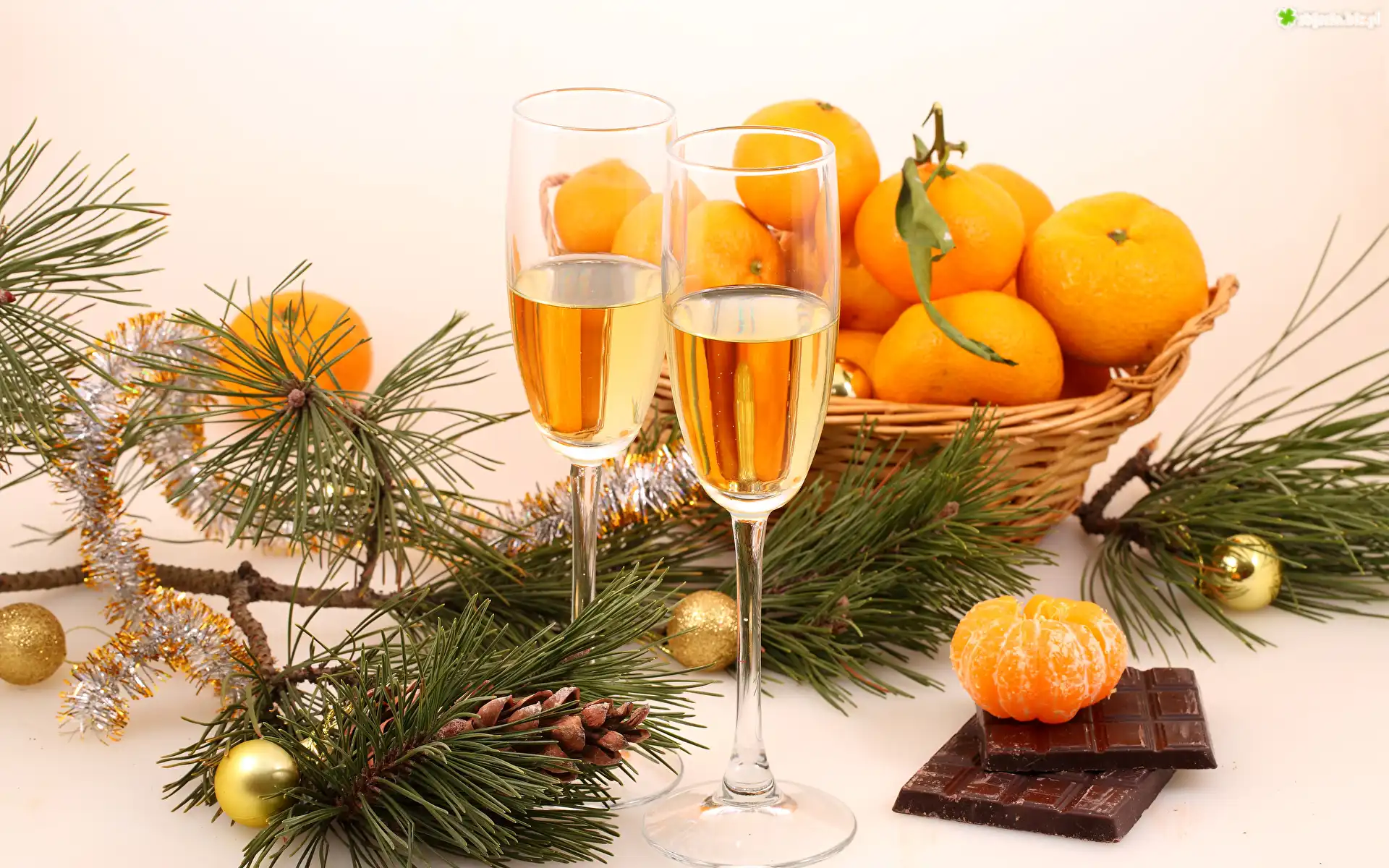 Zdjęcie Kompozycja, Świąteczna, Mandarynki, Koszyk, Czekolada, Szampan, Dwa, Kieliszki, Bombki, Gałązki, Szyszka |