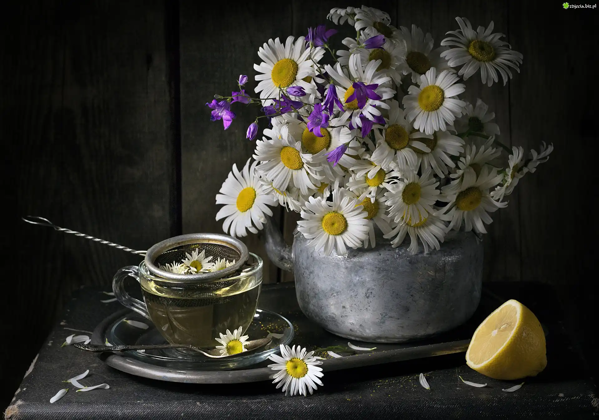 Zdjęcie Margerytki, Bukiet, Herbata, Rumiankowa, Sitko, Cytryna