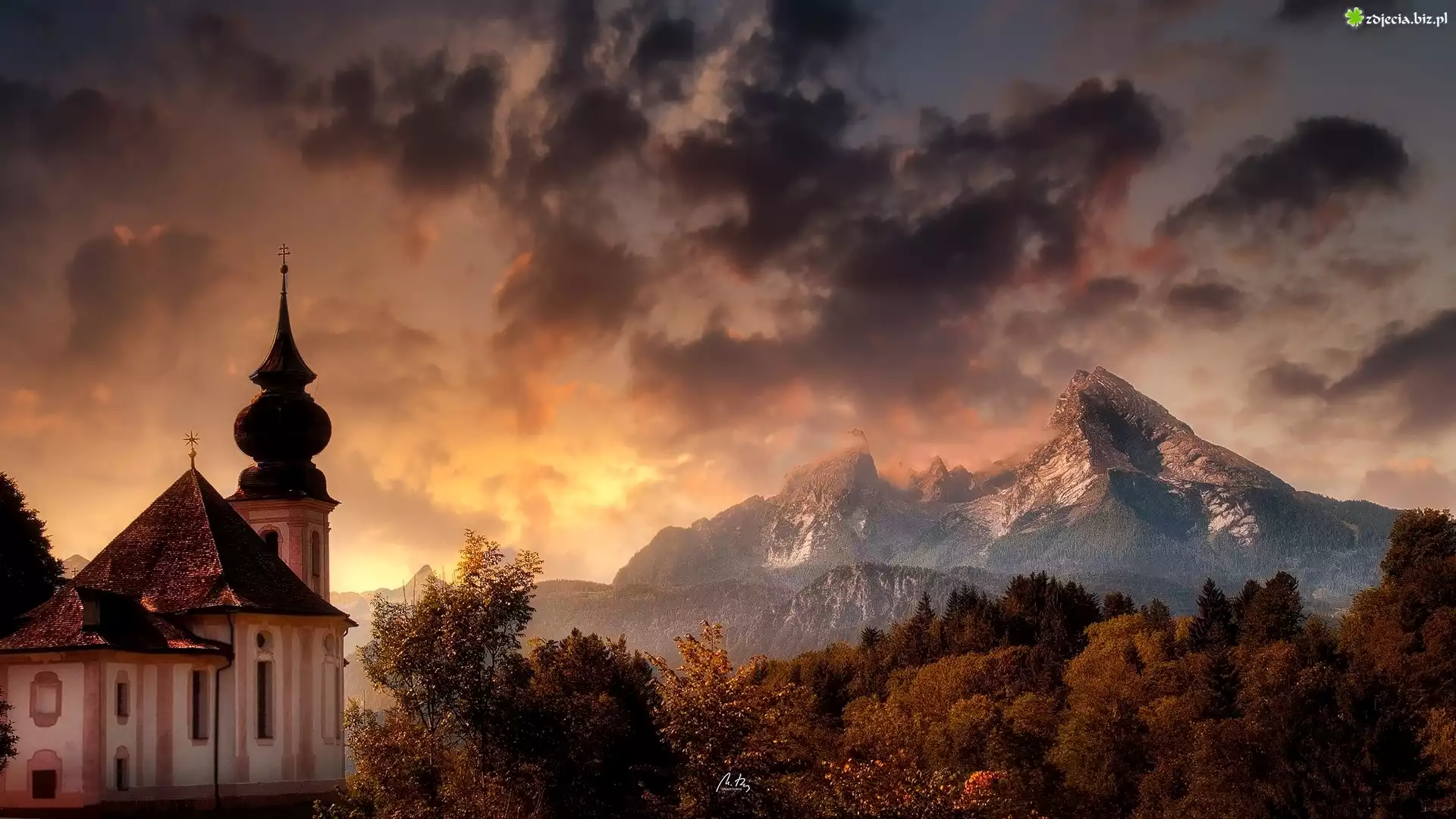 Zdjęcie Kościół, Sanktuarium Maria Gern, Berchtesgaden, Bawaria, Niemcy, Góry, Alpy Salzburskie, Drzewa |