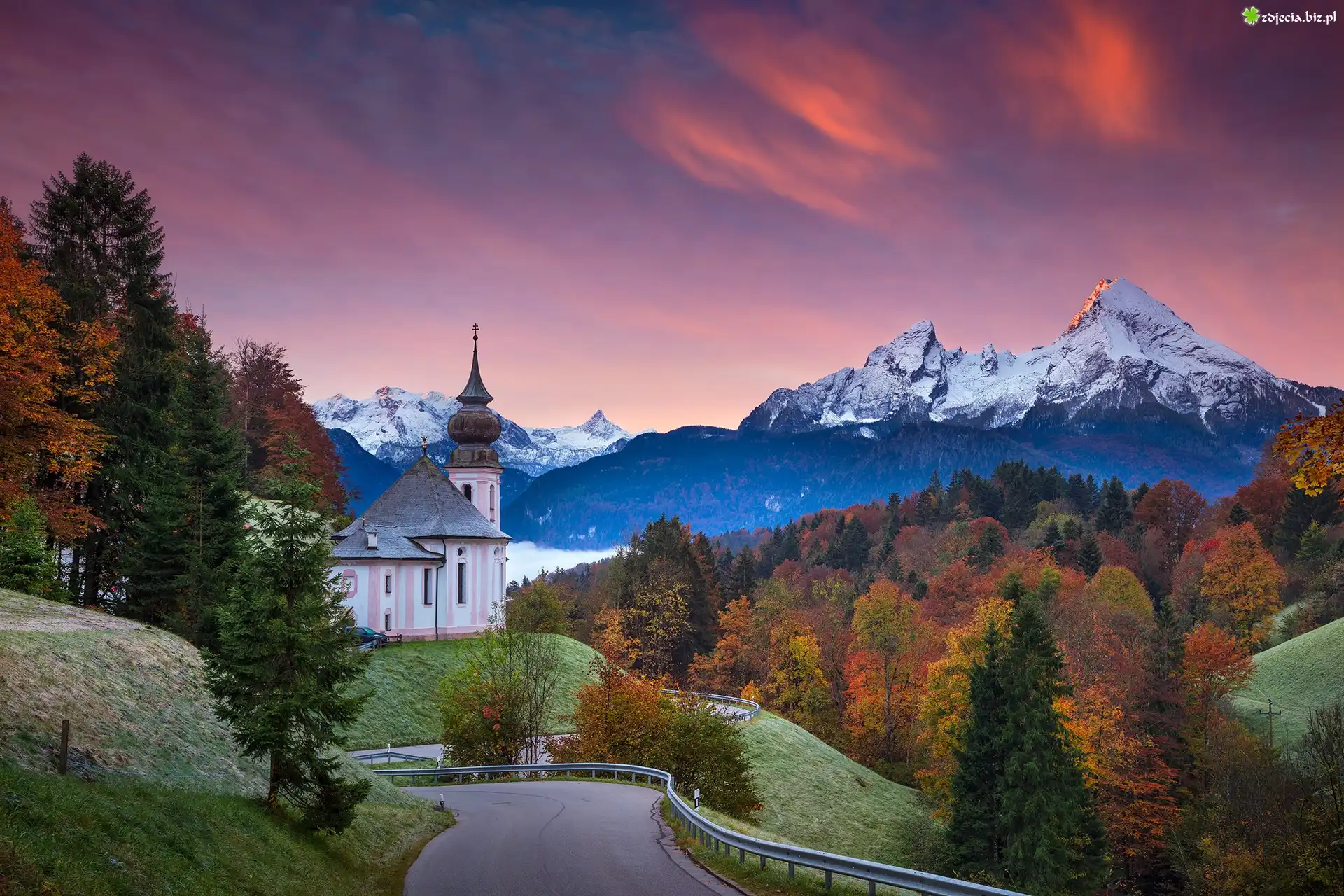 Zdjęcie Niemcy, Bawaria, Berchtesgaden, Kościół, Sanktuarium Maria Gern, Góry, Alpy Salzburskie, Droga, Drzewa |
