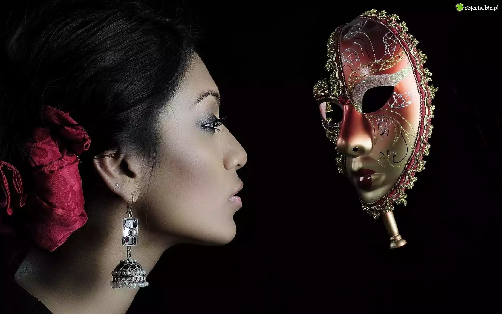 Zdjęcie Brunetka, Profil, Makijaż, Kolczyk, Maska