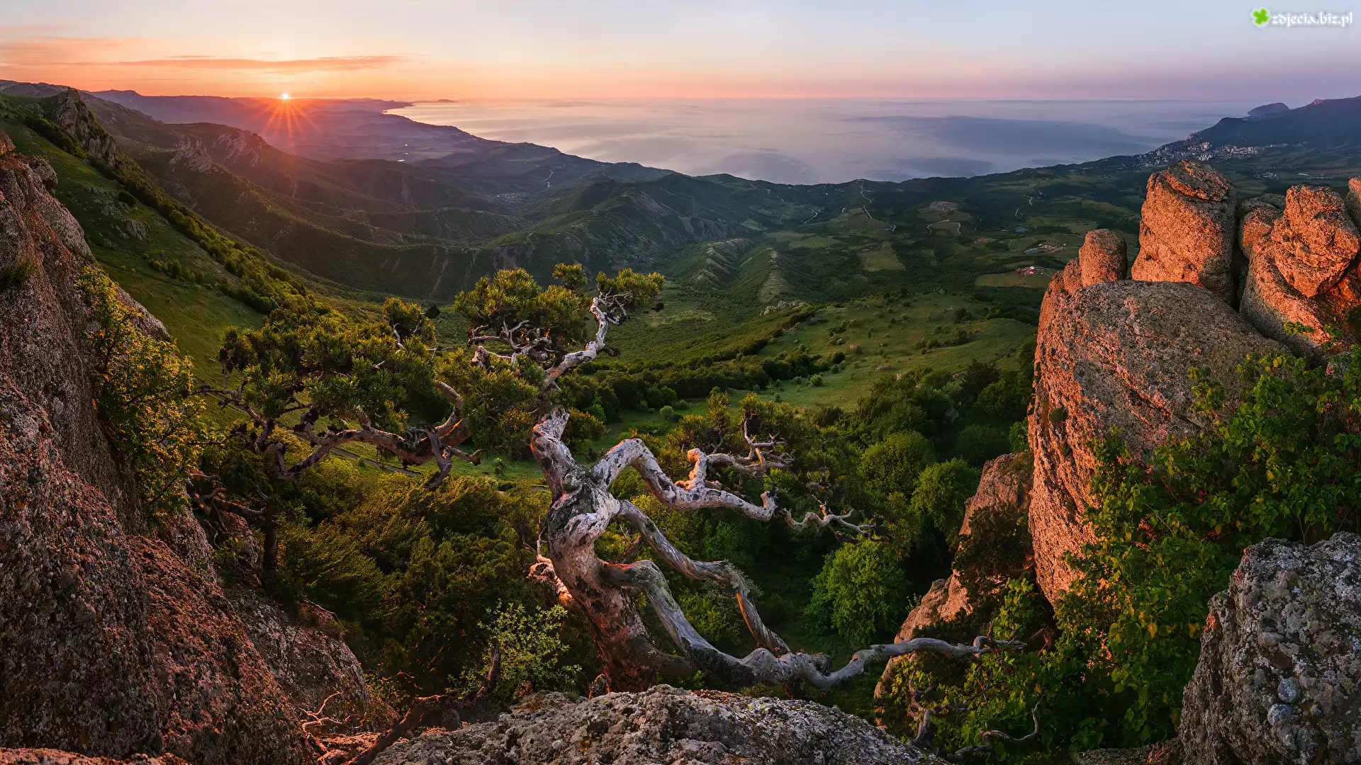 Zdjęcie Góry Krymskie, Masyw Demerdżi, Morze, Sosna, Skały, Promienie słońca, Dolina, Krym