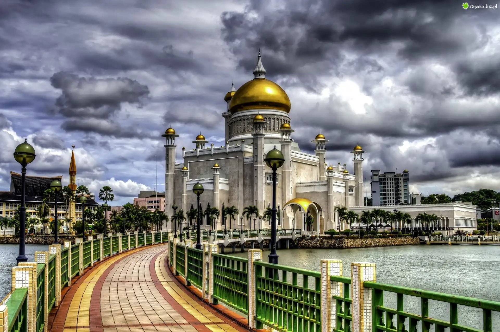 Zdjęcie Meczet Sultan Mosque Omar Ali Saifuddin, Miasto Bandar Seri Begawan, Brunei, Azja, Most, Palmy, Lampy |