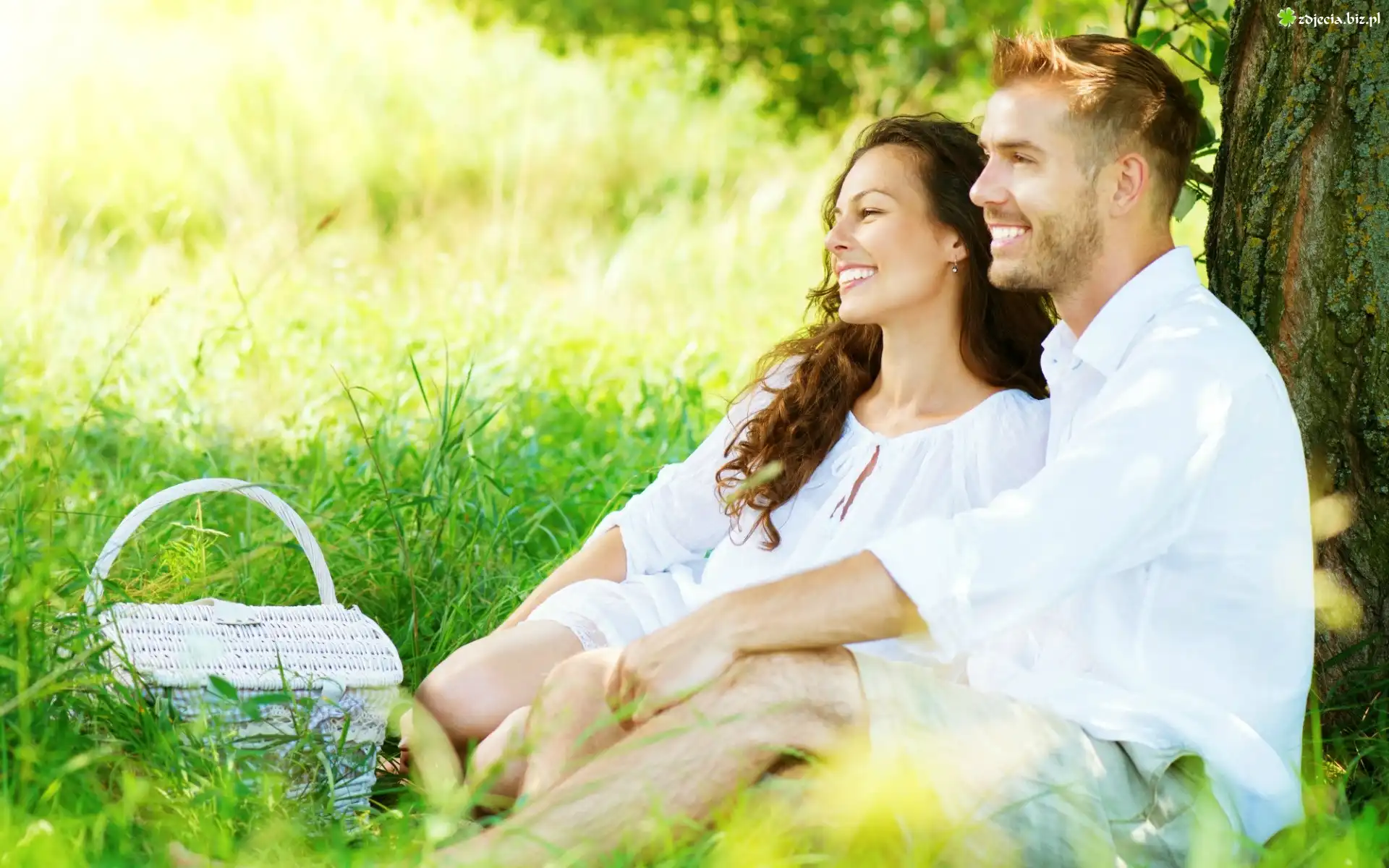 Zdjęcie Kobieta, Mężczyzna, Łąka, Drzewo, Piknik, Światło, Wiosna