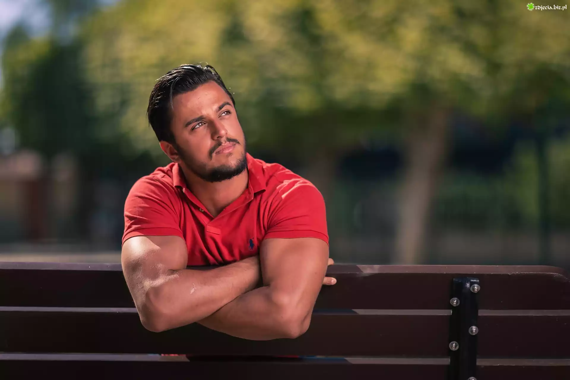 Zdjęcie, Mężczyzna, Broda, Czerwona, Koszulka, Ławka