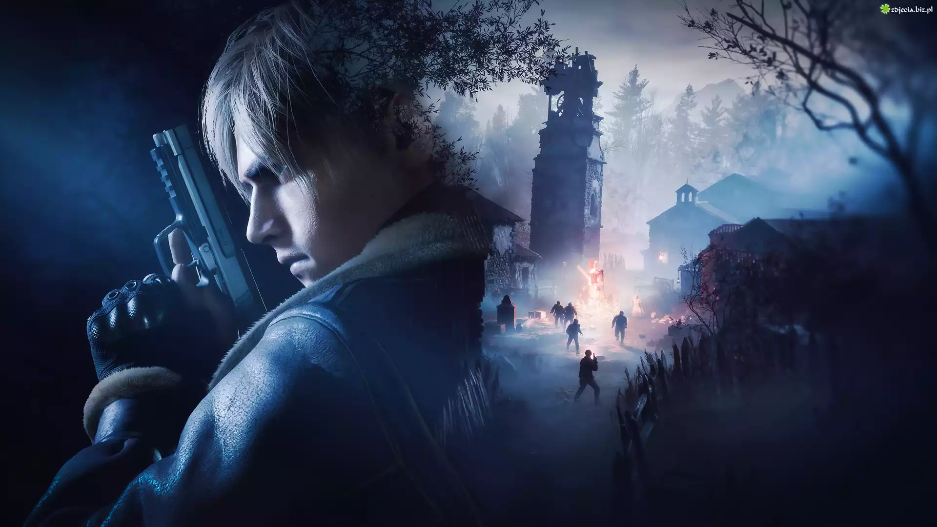 Zdjęcie Gra, Resident Evil 4, Postać, Leon, Mężczyzna, Kurtka, Pistolet, Osada, Ogień