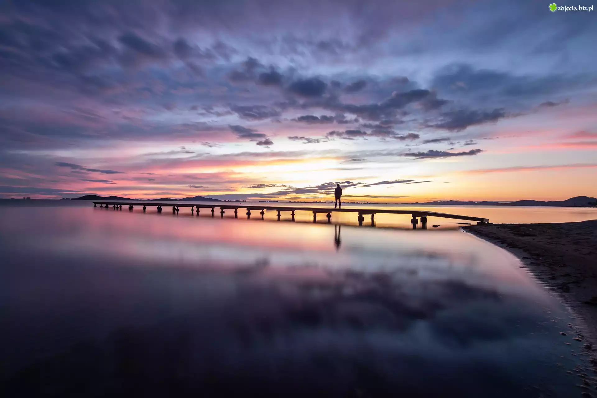 Zdjęcie Hiszpania, Region Murcja, Jezioro, Laguna Mar Menor, Pomost, Mężczyzna, Odbicie, Chmury, Zachód słońca, Niebo |