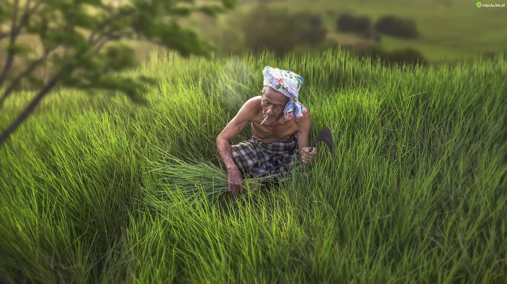 Zdjęcie Starszy, Mężczyzna, Papieros, Chustka, Trawa, Drzewa, Rozmycie