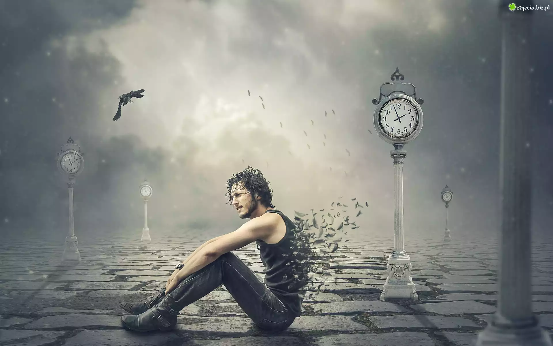 Zdjęcie, Mężczyzna, Piórka, Ptaki, Zegary, Fantasy