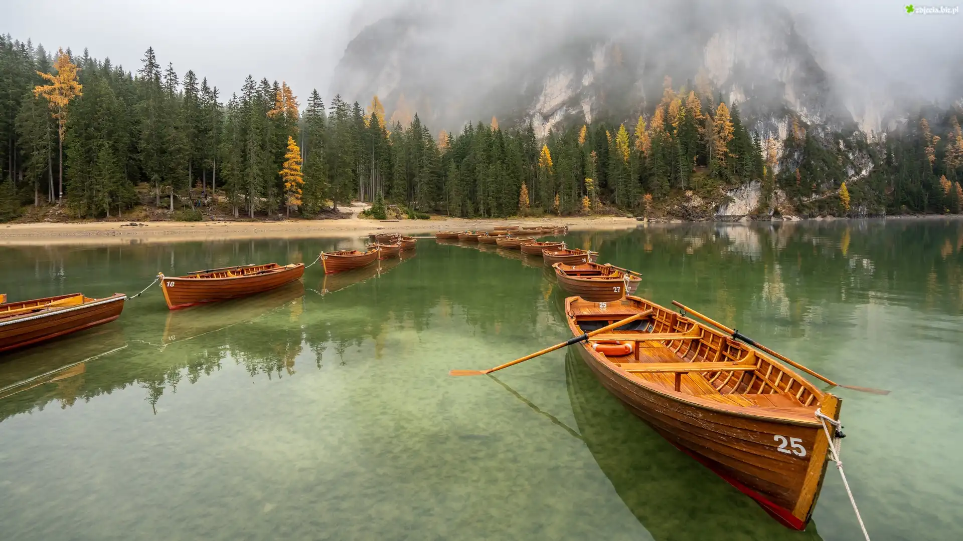 Zdjęcie Włochy, Tyrol, Dolomity, Jezioro, Pragser Wildsee, Łódki, Las, Mgła