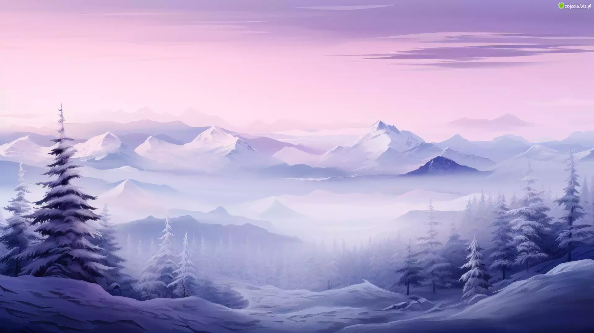 Zdjęcie Zima, Mgła, Góry, Drzewa, 2D