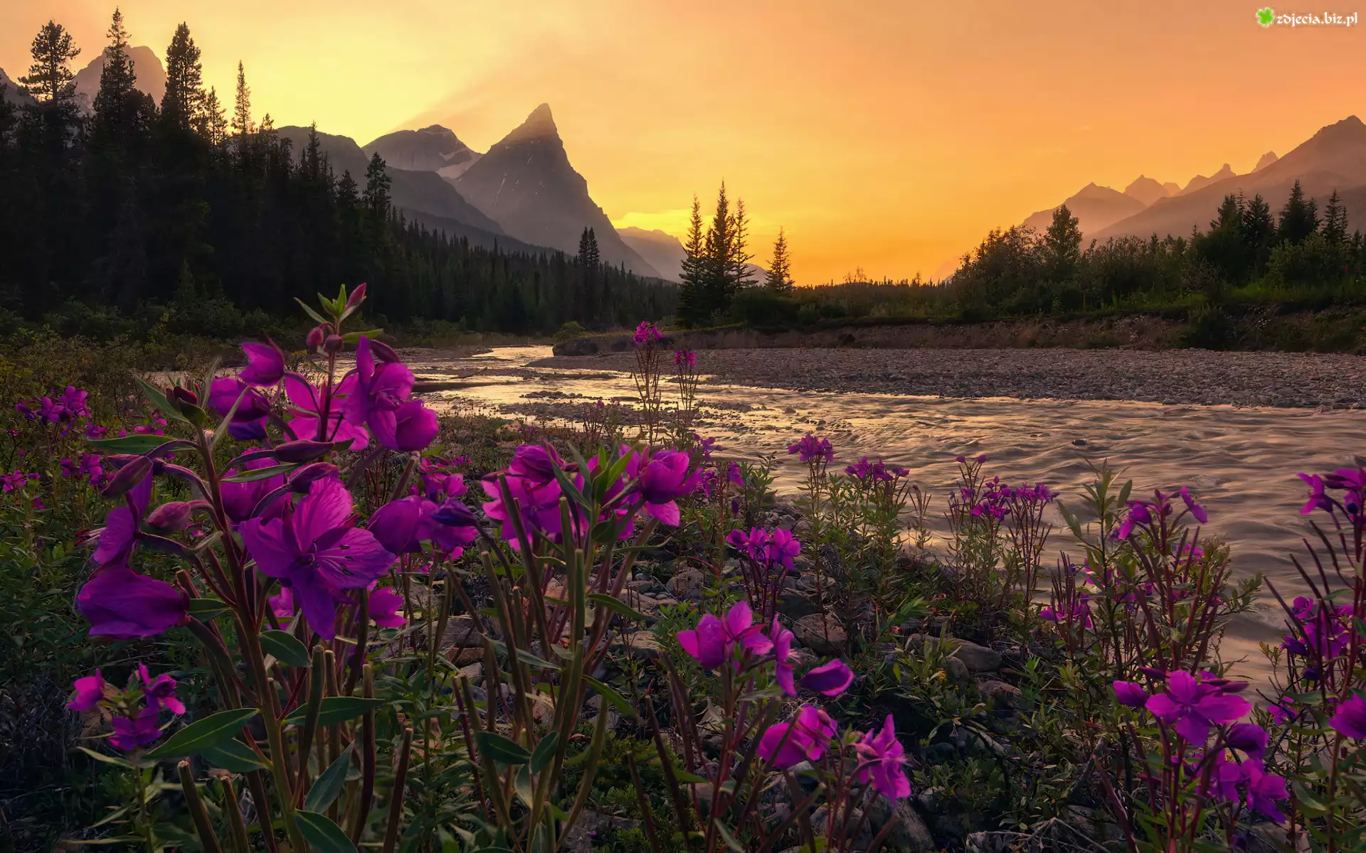 Zdjęcie Zachód słońca, Góry, Drzewa, Rzeka, Kamienie, Kwiaty, Mgła