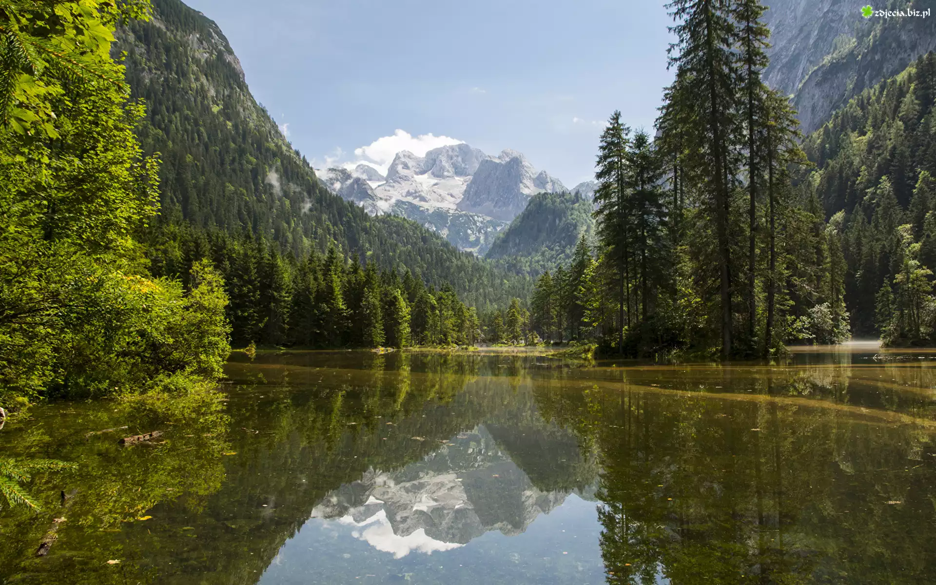 Zdjęcie Austria, Góry Dachstein, Jezioro Gosauseen, Drzewa, Las, Niebo, Chmury, Mgła