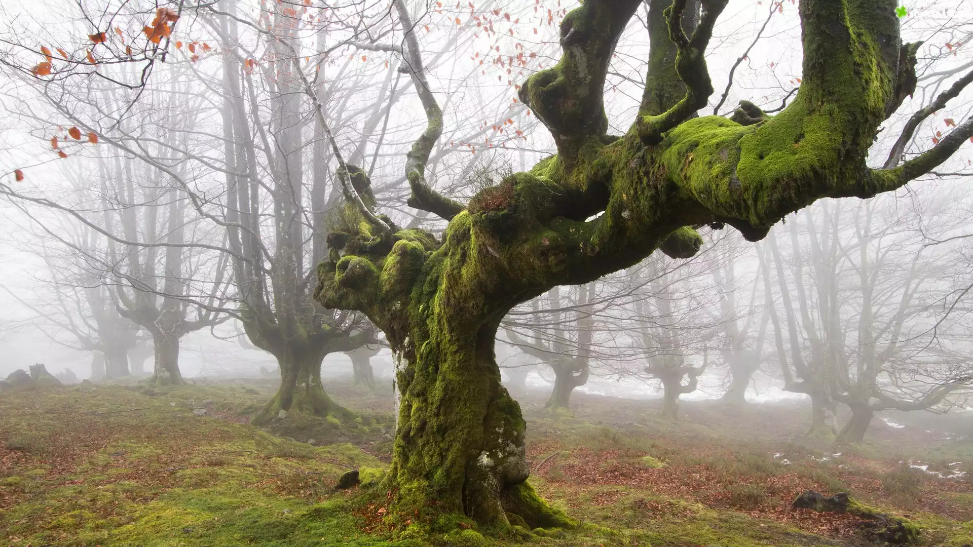 Zdjęcie Jesień, Mgła, Stare, Krzywe, Drzewo, Liście, Mech