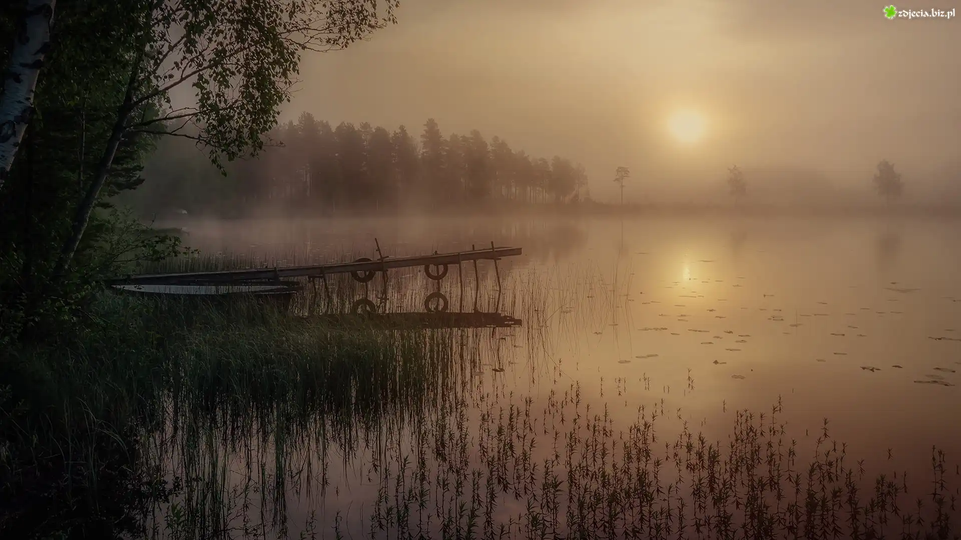 Zdjęcie Mgła, Jezioro, Drzewa, Pomost, Łódka, Słońce
