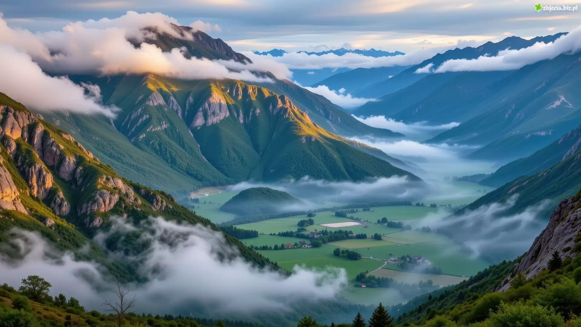Zdjęcie Góry, Chmury, Opadająca, Mgła, Dolina, Domy, Drzewa