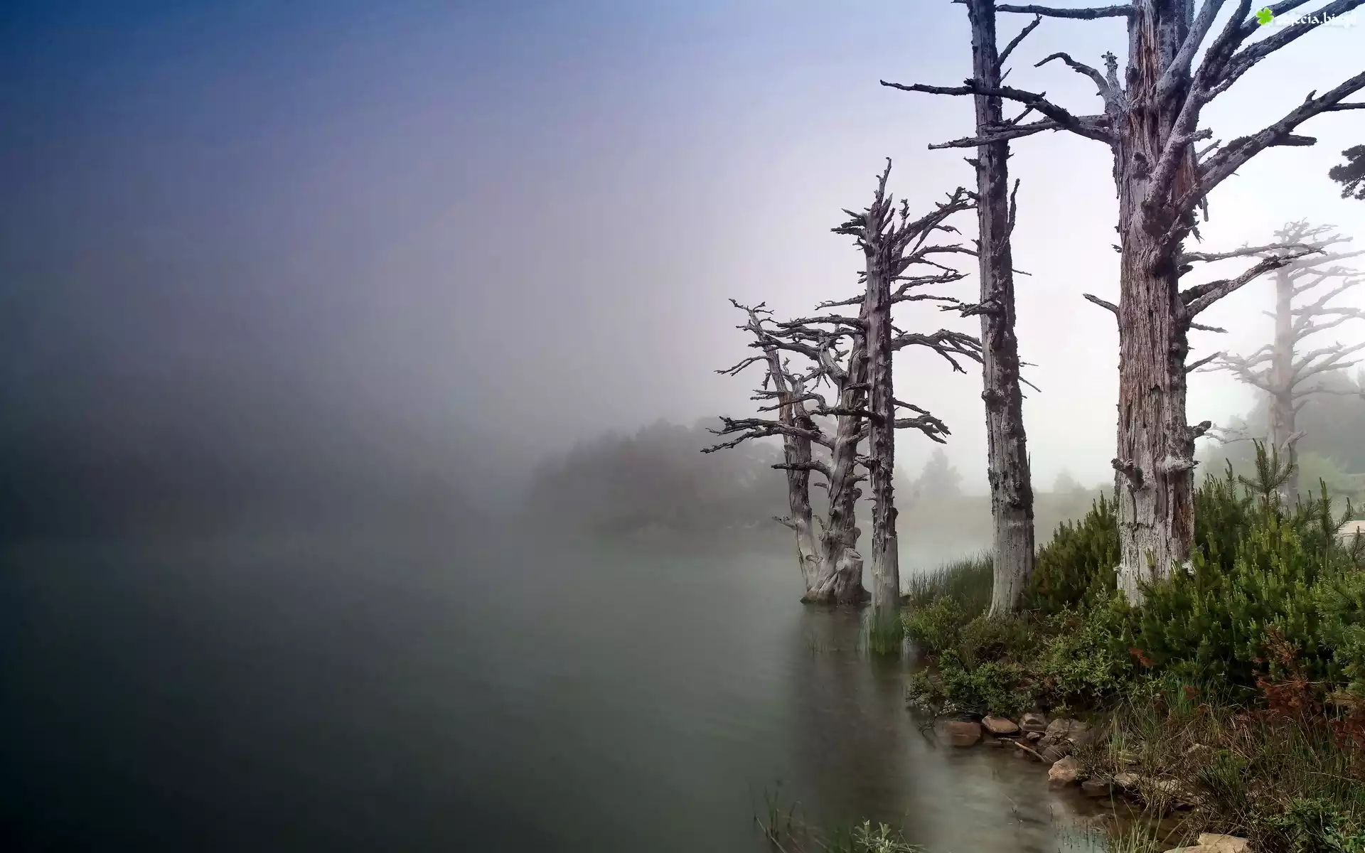 Zdjęcie Mgła, Jezioro, Brzeg, Suche Drzewa