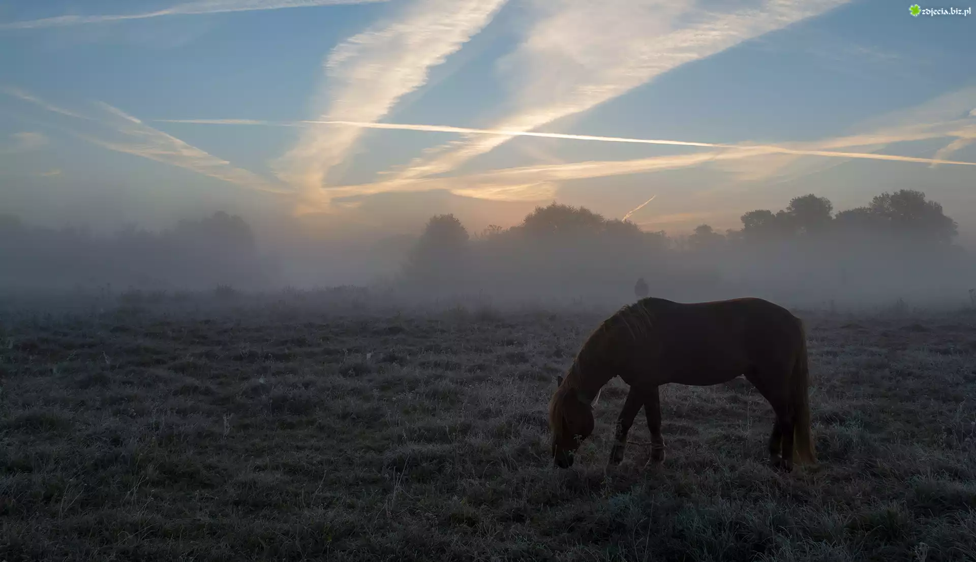 Zdjęcie Mgła, Łąka, Koń, Trawa, Szron, Drzewa
