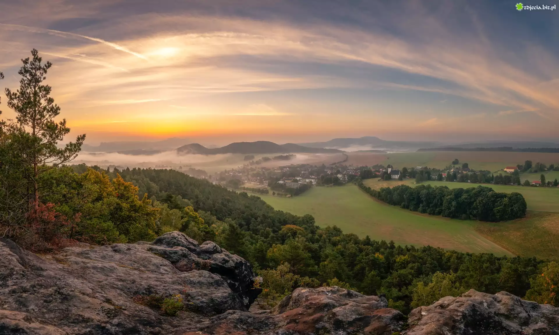 Zdjęcie Niemcy, Saska Szwajcaria, Góry Połabskie, Skały, Las, Drzewa, Domy Mgła, Wschód słońca |