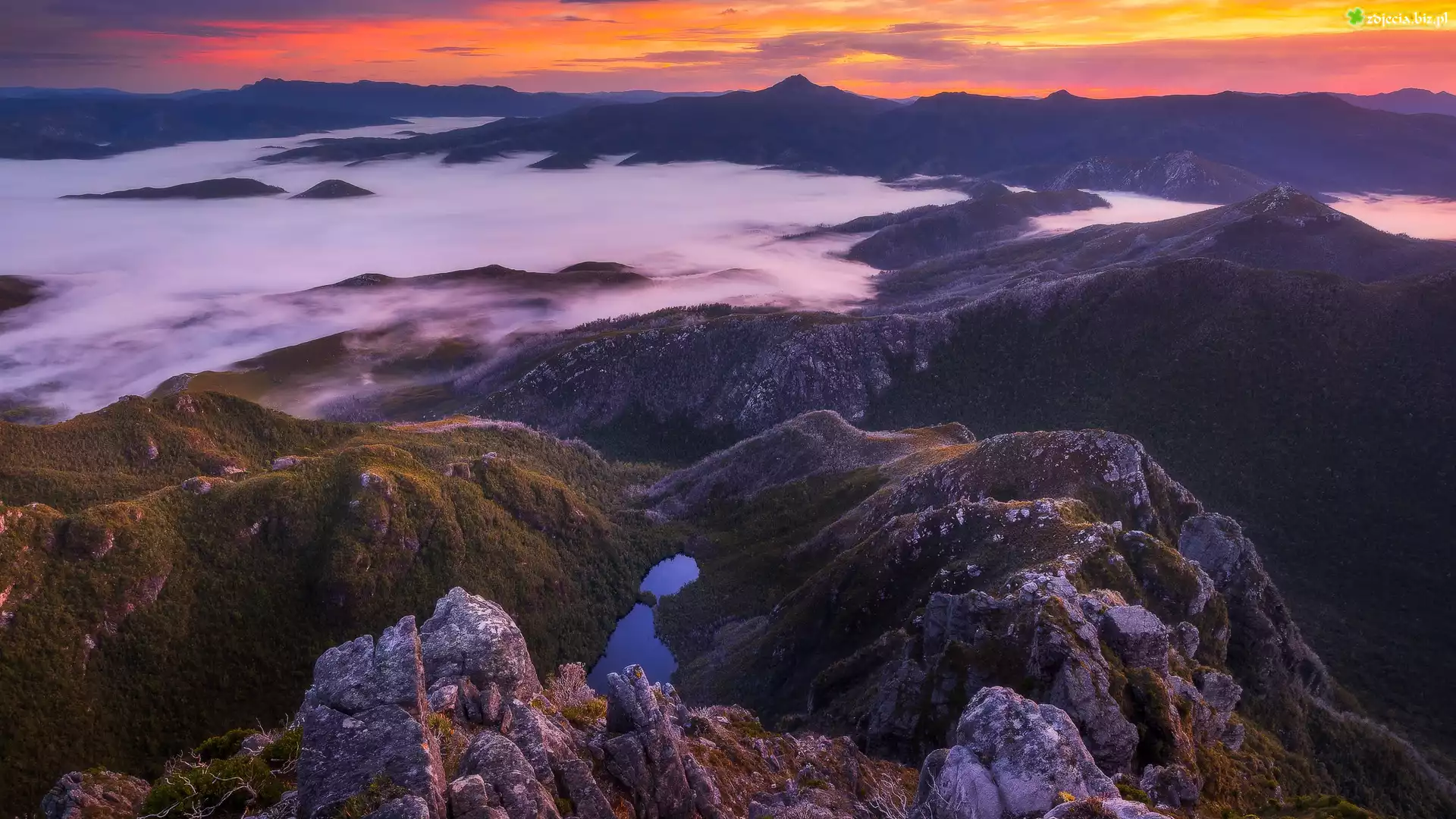 Zdjęcie Mgła, Zachód słońca, Góry, Arthur Range, Jeziora, Skały, Tasmania, Australia