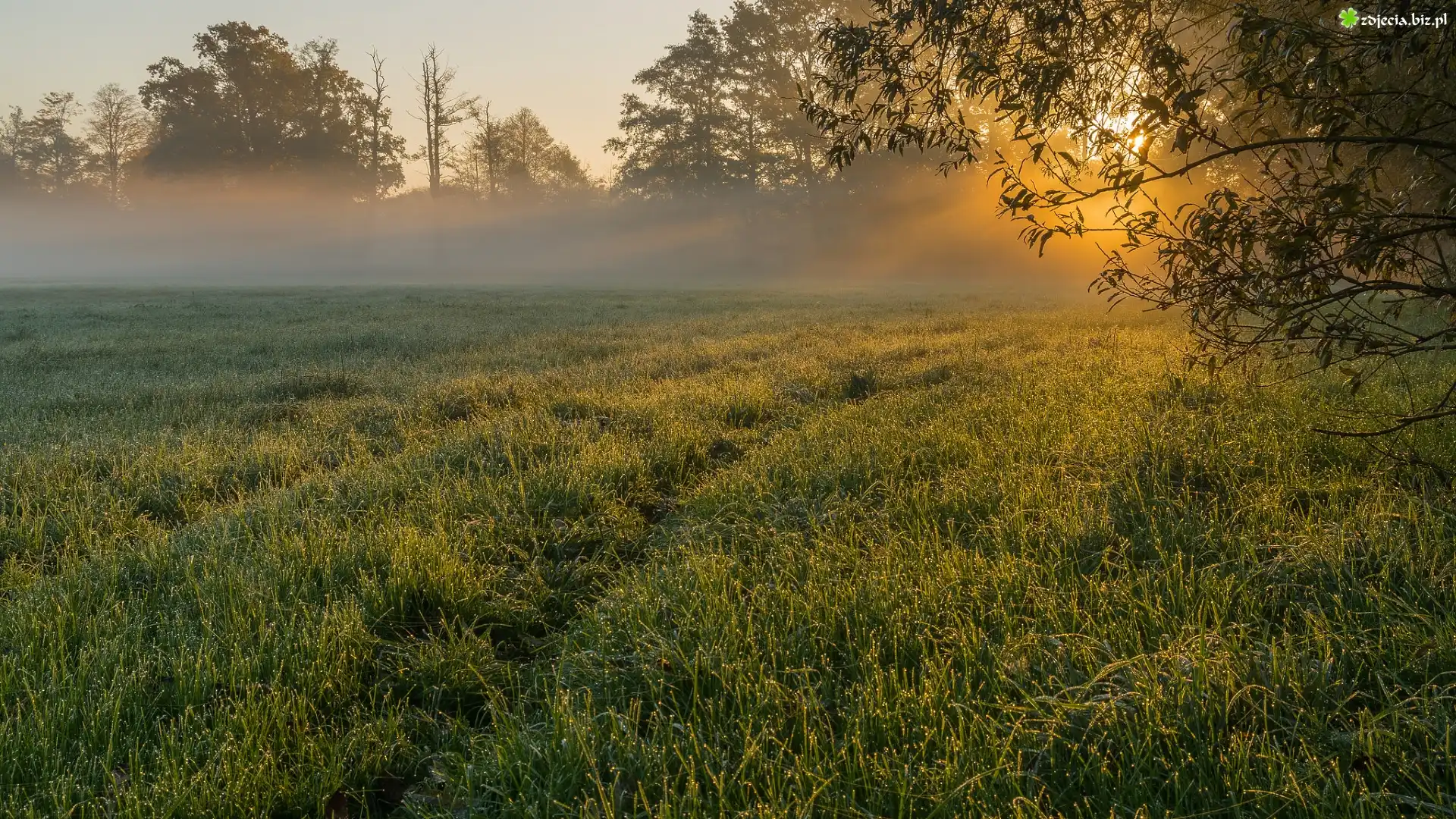 Zdjęcie Łąka, Trawa, Drzewa, Mgła, Poranek