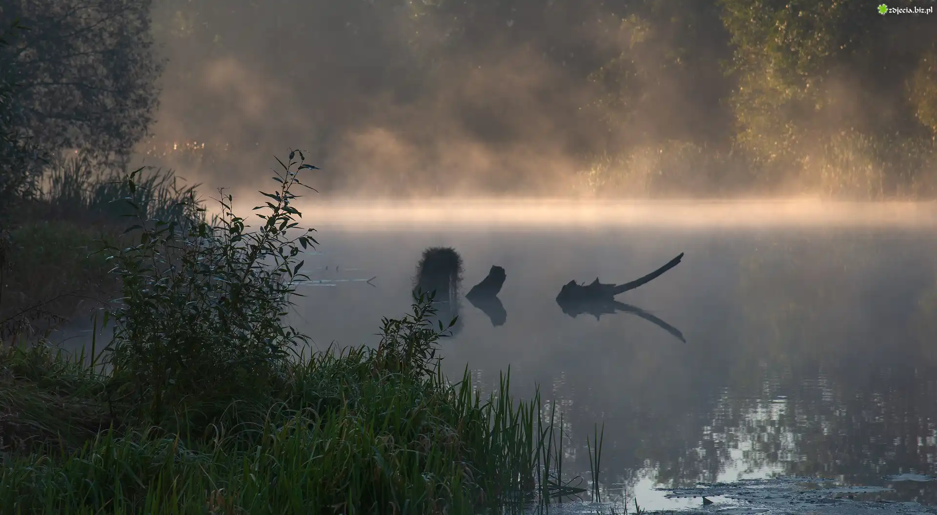 Zdjęcie, Mgła, Drzewa, Rośliny, Trawa, Rzeka