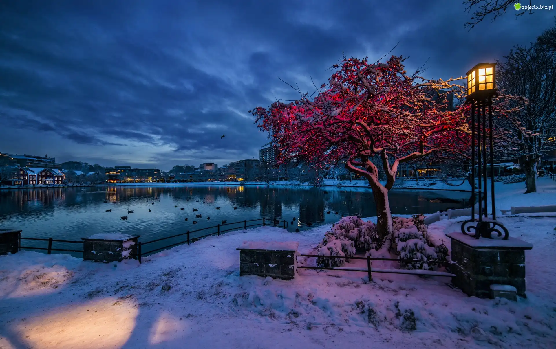 Zdjęcie Miasteczko, Jezioro, Latarnia, Zima, Norwegia