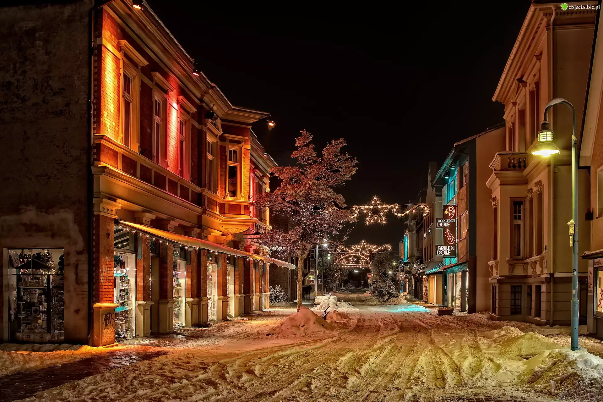 Zdjęcie Miasto, Nocą, Śnieg, Dekoracje, Bożonarodzeniowe
