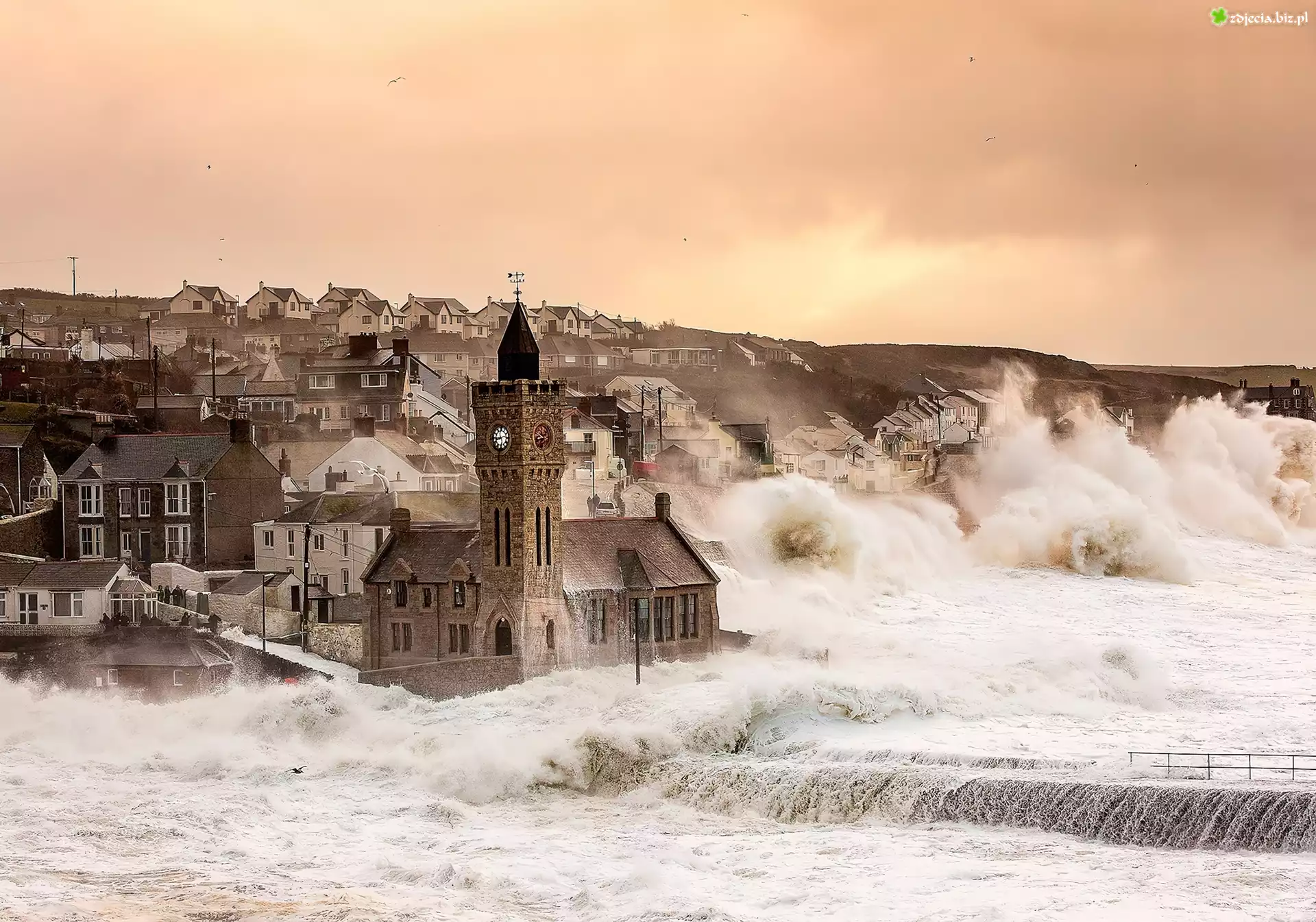 Zdjęcie Miasto, Domy, Budowle, Morze, Fala, Sztorm