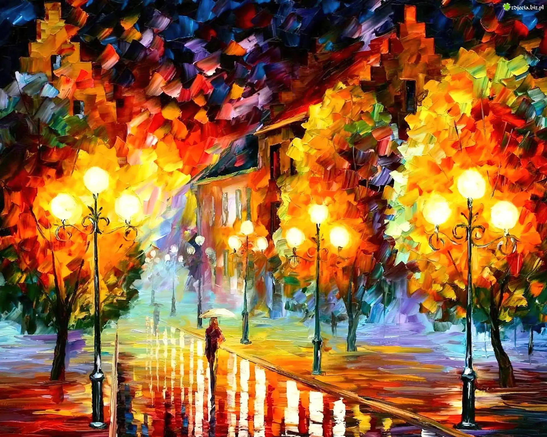 Zdjęcie Jesień, Miasto, Noc, Drzewa, Latarnie, Deszcz, Odbicie