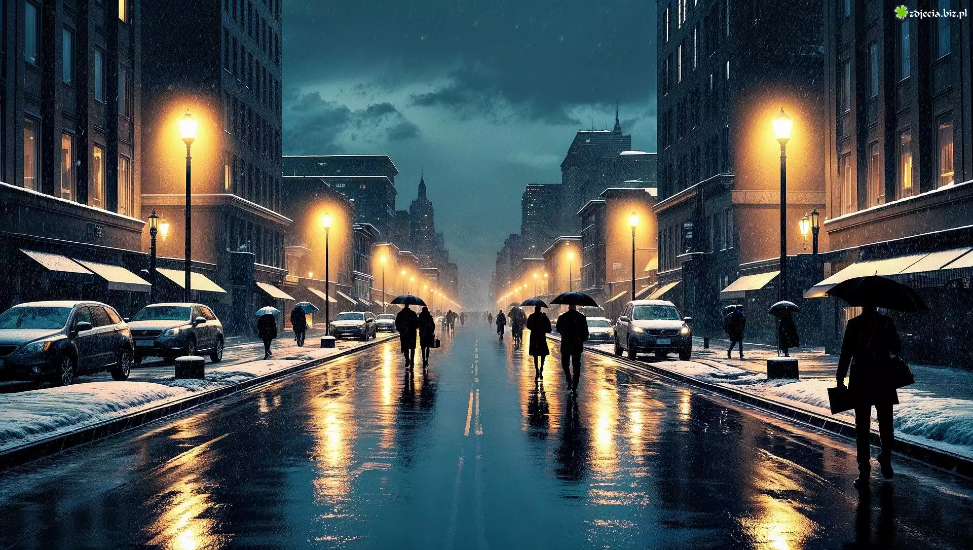 Zdjęcie Miasto, Domy, Ulica, Światła, Latarnie, Droga, Wieczór, Ludzie, Śnieg