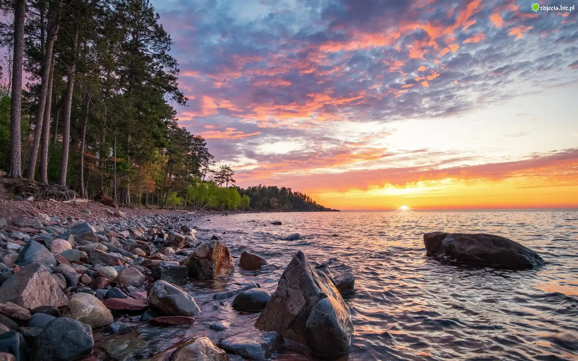 Zdjęcie Stany Zjednoczone, Stan Michigan, Marquette, Jezioro, Superior Lake, Kamienie, Las, Drzewa, Zachód słońca |