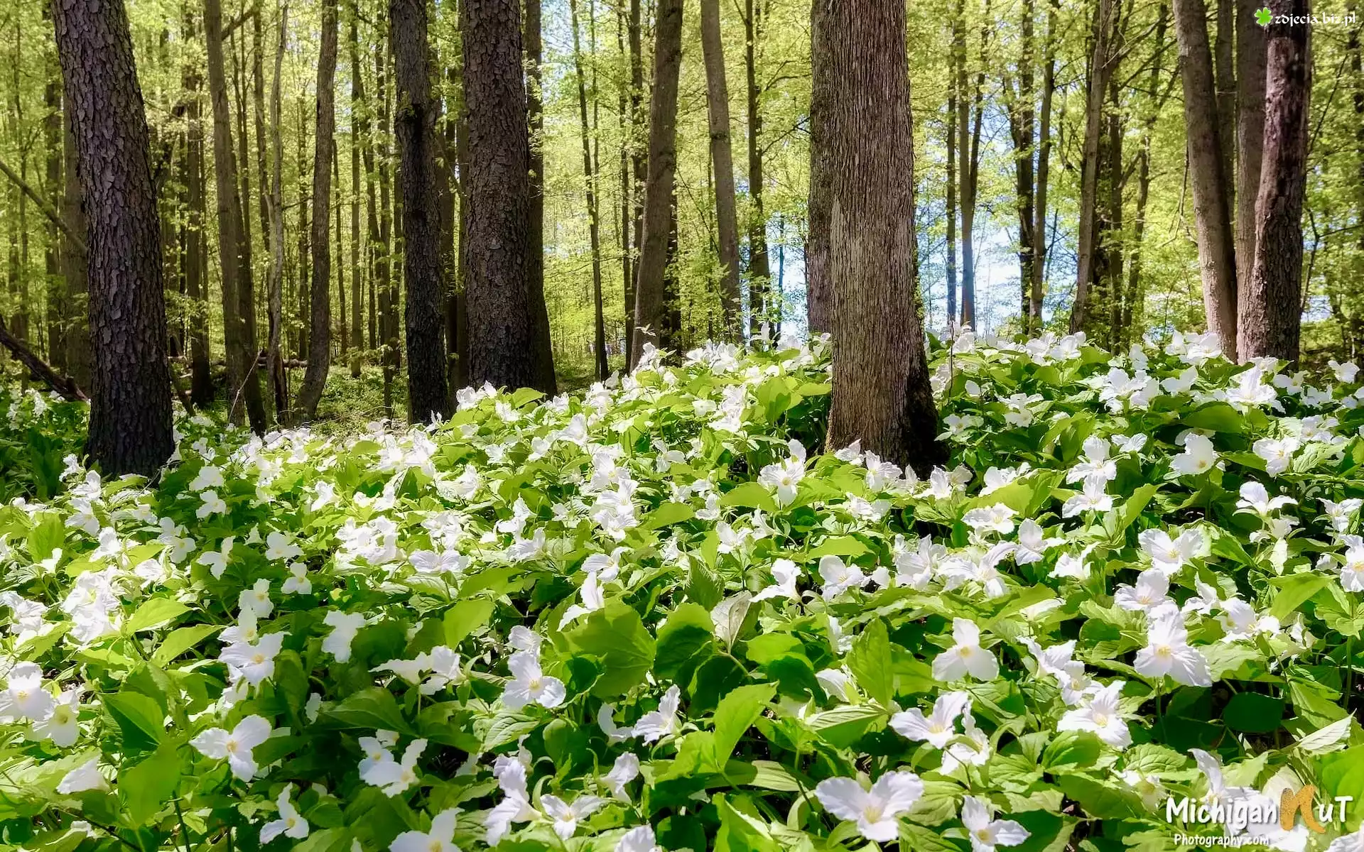Zdjęcie Las, Manistee National Forest, Drzewa, Białe, Kwiaty, Trójlisty wielkokwiatowe, Michigan, Stany Zjednoczone |