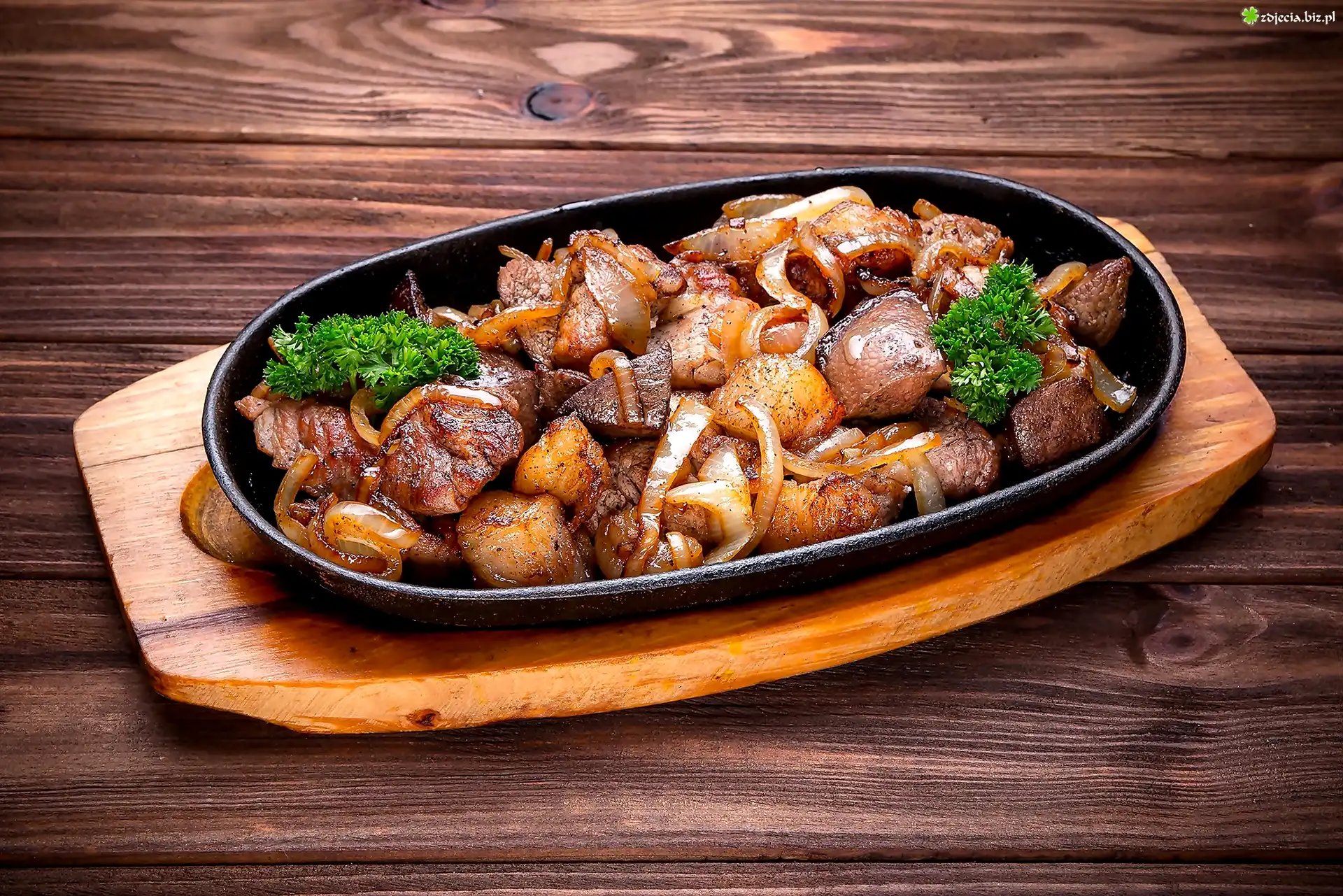 Zdjęcie, Mięso, Cebula, Zielenina, Przyprawy, Deska
