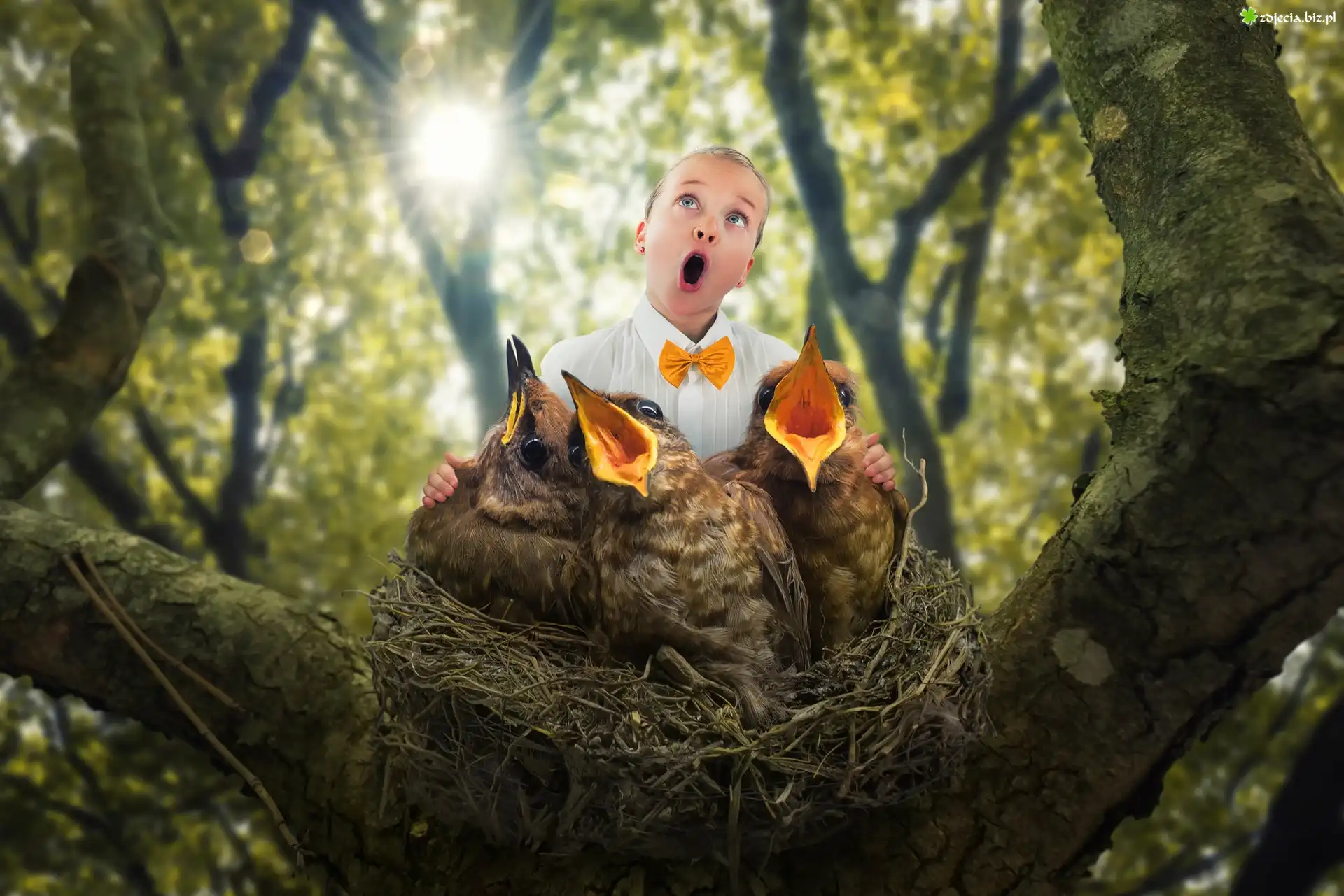Zdjęcie Śmieszne, Drzewo, Ptaki, Gniazdo, Dziecko, Chór