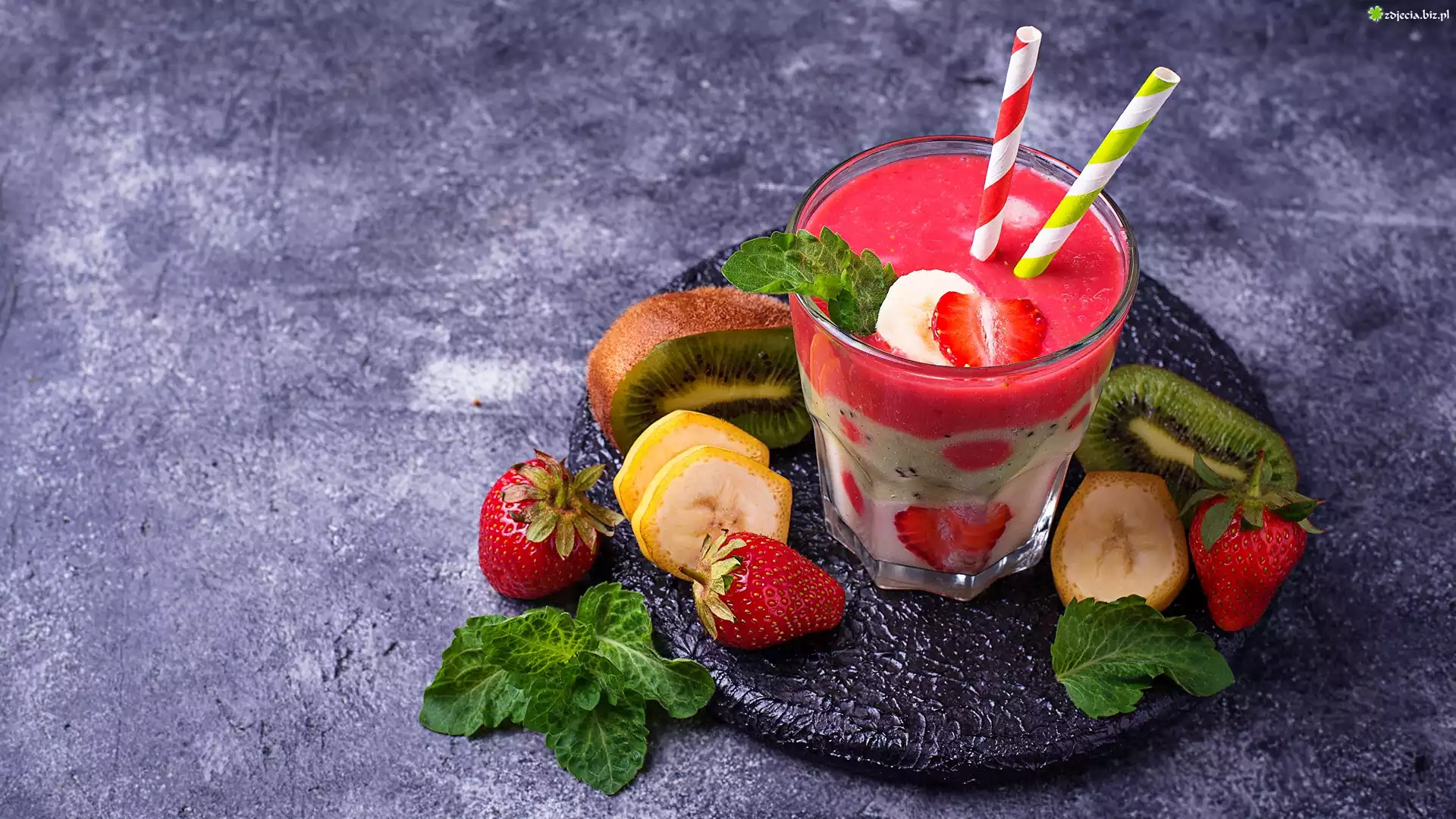 Zdjęcie Napój, Smoothie, Szklanka, Słomki, Owoce, Banan, Truskawki, Kiwi, Mięta