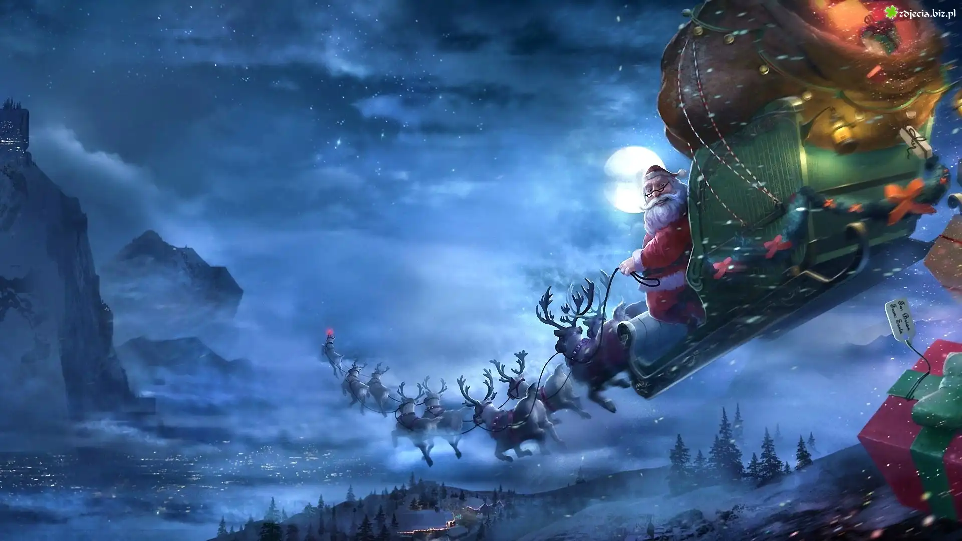 Zdjęcie Mikołaj, Renifery, Sanie, Prezenty, Noc