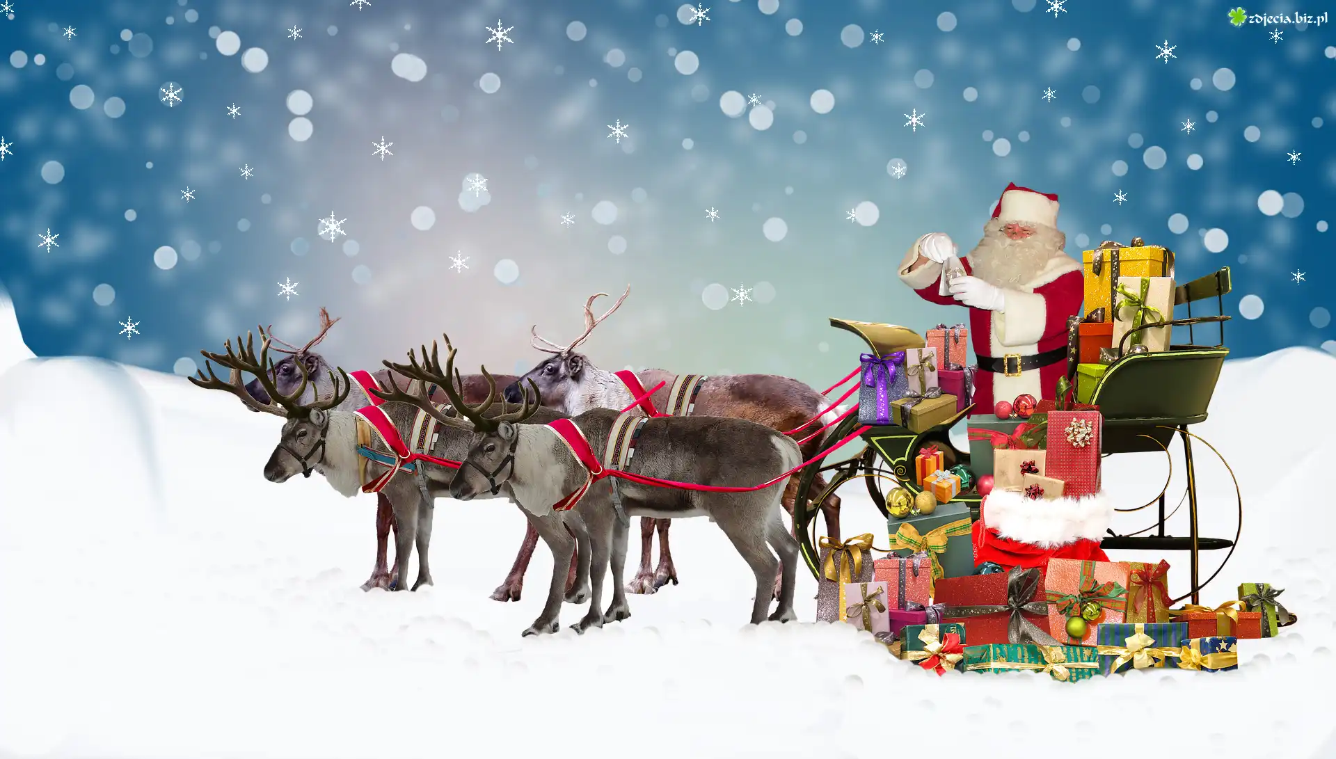 Zdjęcie Mikołaj, Sanie, Renifery, Prezenty