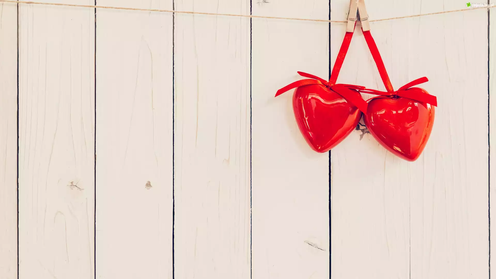 Zdjęcie, Walentynki, Miłość, Dwa, Serca, Czerwone, Wstążeczki, Sznurek, Klamerki
