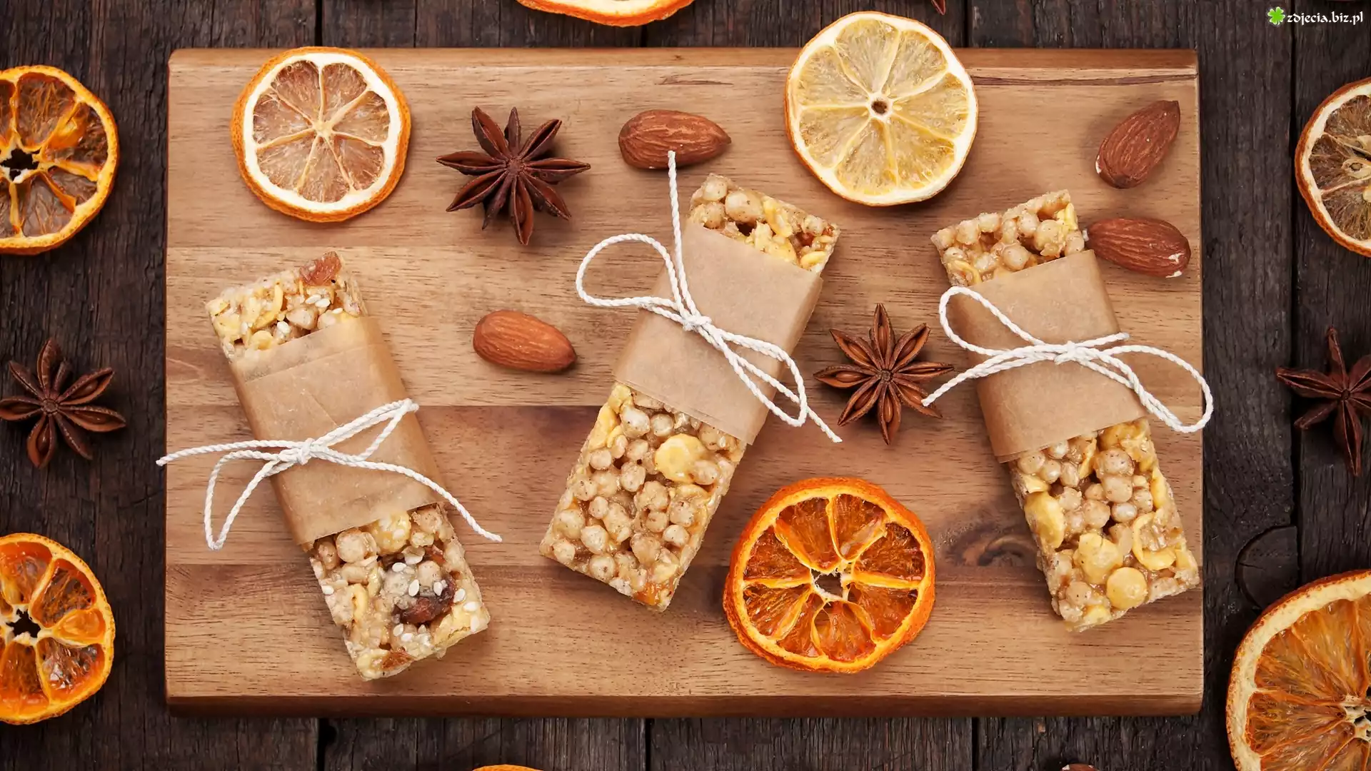 Zdjęcie Batoniki, Miód, Karmel, Anyż, Migdały, Plastry, Pomarańczy, Deska